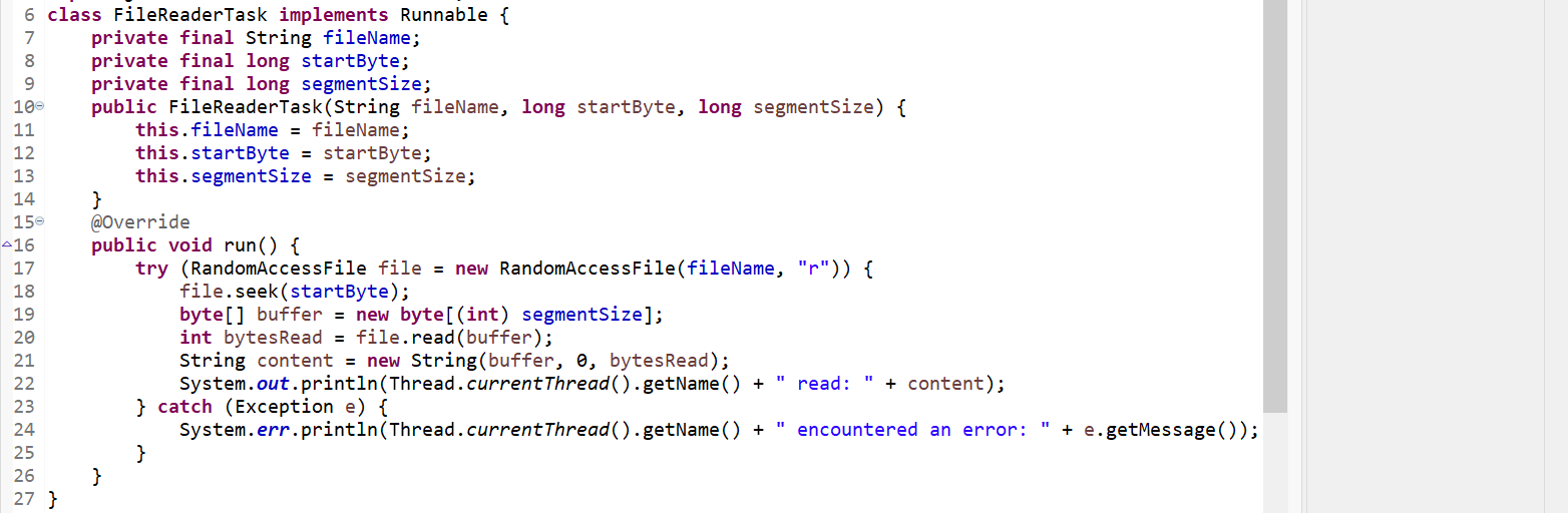This FileReaderTask class encapsulates the task every thread would carry out. In this design, it will be implementing the interface Runnable. Such an interface facilitates the implementation being executed through some thread; such a Runnable is encapsulated in a single instance. Each of the files to be processed is specified. The specific block of file segment to read through is identified using the attributes, fileName, startByte and segmentSize.