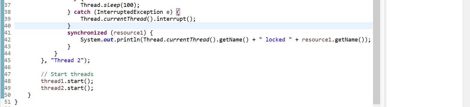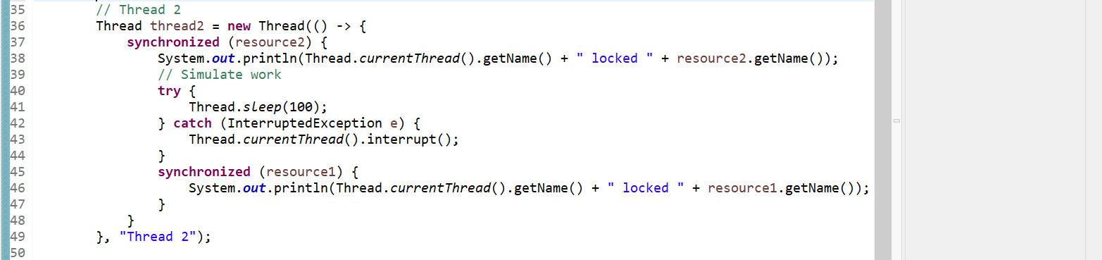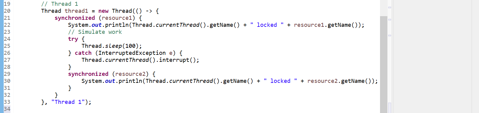 Thread 1 locks resource1 by using a synchronized block first, then waits on resource2 with the possibility of acquiring it only after a simulated delay. The sleep period (Thread.sleep(100)) has been added for making the chance of deadlock even greater by giving opportunity to Thread 2 to take the second lock in its favour. Synchronized block is there to lock the resource1 exclusively up to Thread1 until that block is out from the control.