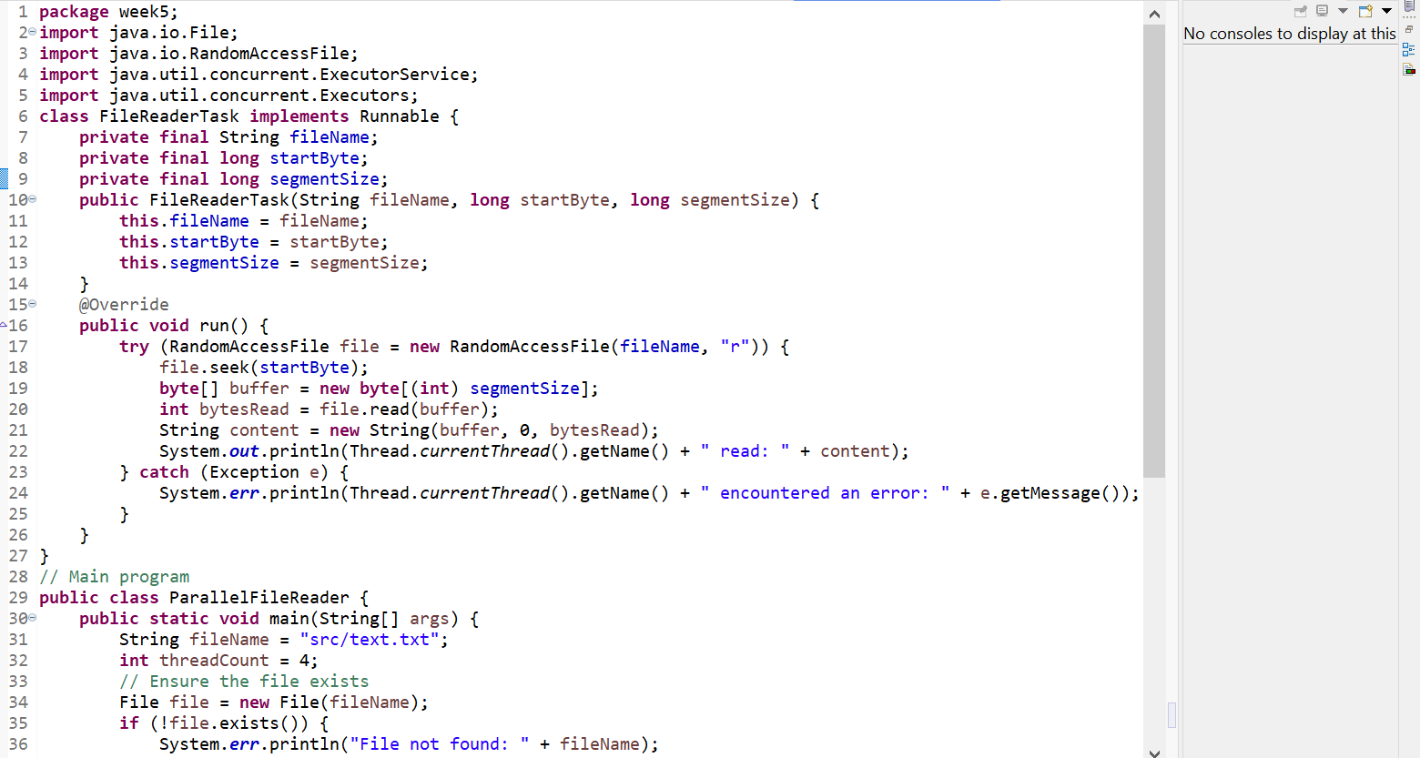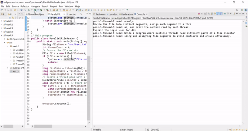 runmethod uses aRandomAccessFileobject to navigate to the designated segment (file.seek(startByte)) and reads the specified number of bytes into a buffer. - Every thread prints the contents of their piece to the console, and shows the respective portion of the file. Note how