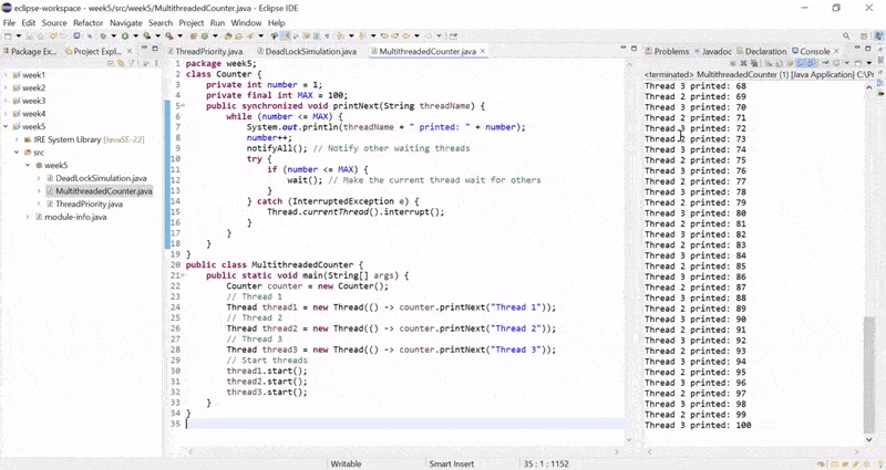 If we observe the output of the program then it is very simple to understand that all the threads are executing and printing the numbers in the correct order irrespective of the order of the threads. The program has printed numbers from 1 to 100 in the correct order with the help of the multiple threads. This shows how synchronization is used effectively to maintain a sequential order in a multithreaded environment. The combination of synchronized methods and wait notify ensures that each thread cooperates to produce the desired output.