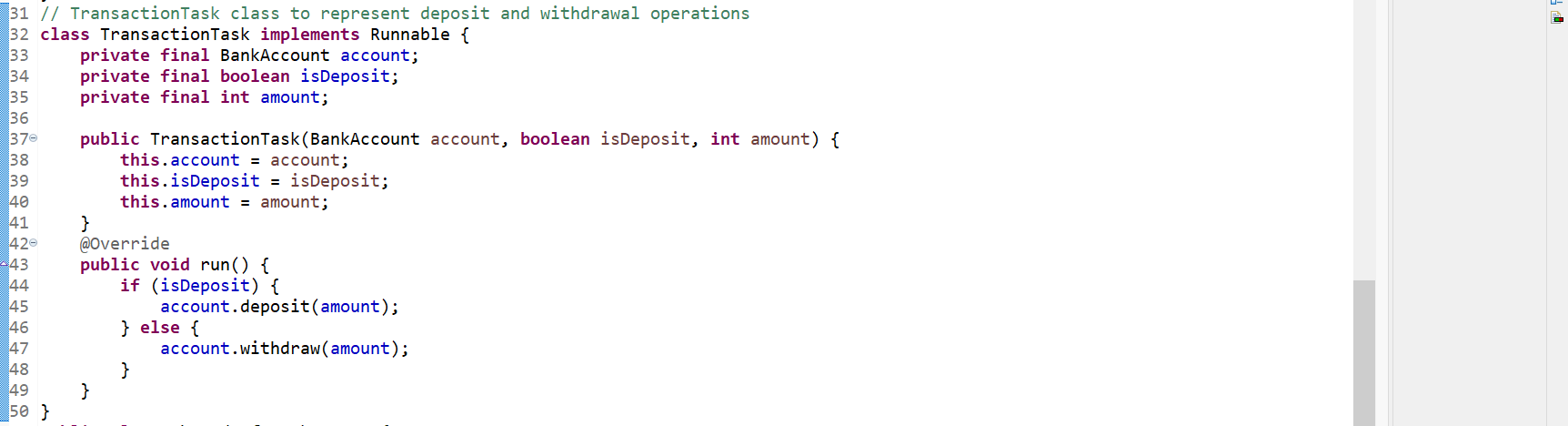 The TransactionTask class implements the Runnable interface to define deposit and withdrawal tasks that operate on a shared BankAccount.