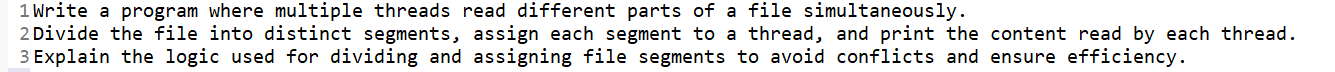 Below is the detailed description of the program using multiple threads to read different parts of a file in parallel. Each section has relevant code snippets.