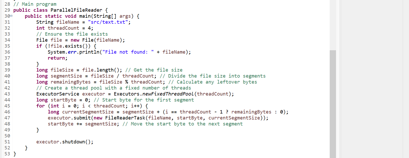 Executors.newFixedThreadPoolis used to avoid the overhead of creating and destroying threads and properly utilize available resources . - Task Assignment: All the segments are iterated through using a