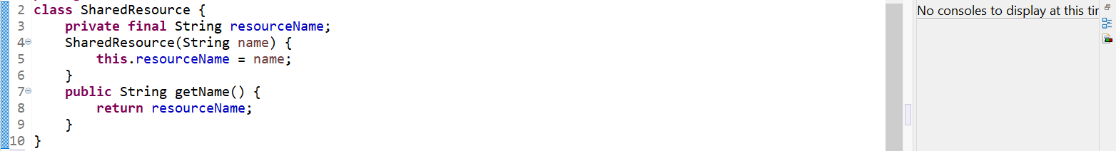 The SharedResource class is defined to represent a shared resource that multiple threads will attempt to access. It has only one field, resourceName, to identify the resource, and a constructor that initializes this name. The getName method is used to retrieve the resource's name for display purposes. This class is basic to demonstrating the shared resource locking in the simulation: