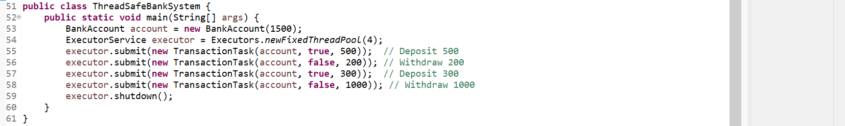 The program uses an ExecutorService with a fixed thread pool to manage concurrent threads. Four tasks, two deposits and two withdrawals, are submitted for execution. The shared BankAccount ensures that all threads interact safely with the account, preventing data corruption.
