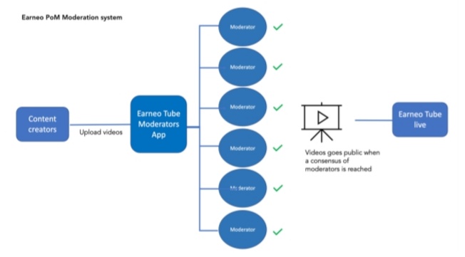 The moderation of contents on the Earneo network is not centralized, rather it is based on a voluntary community. This community reviews and approves the appropriate videos that will be accessible on the platform.