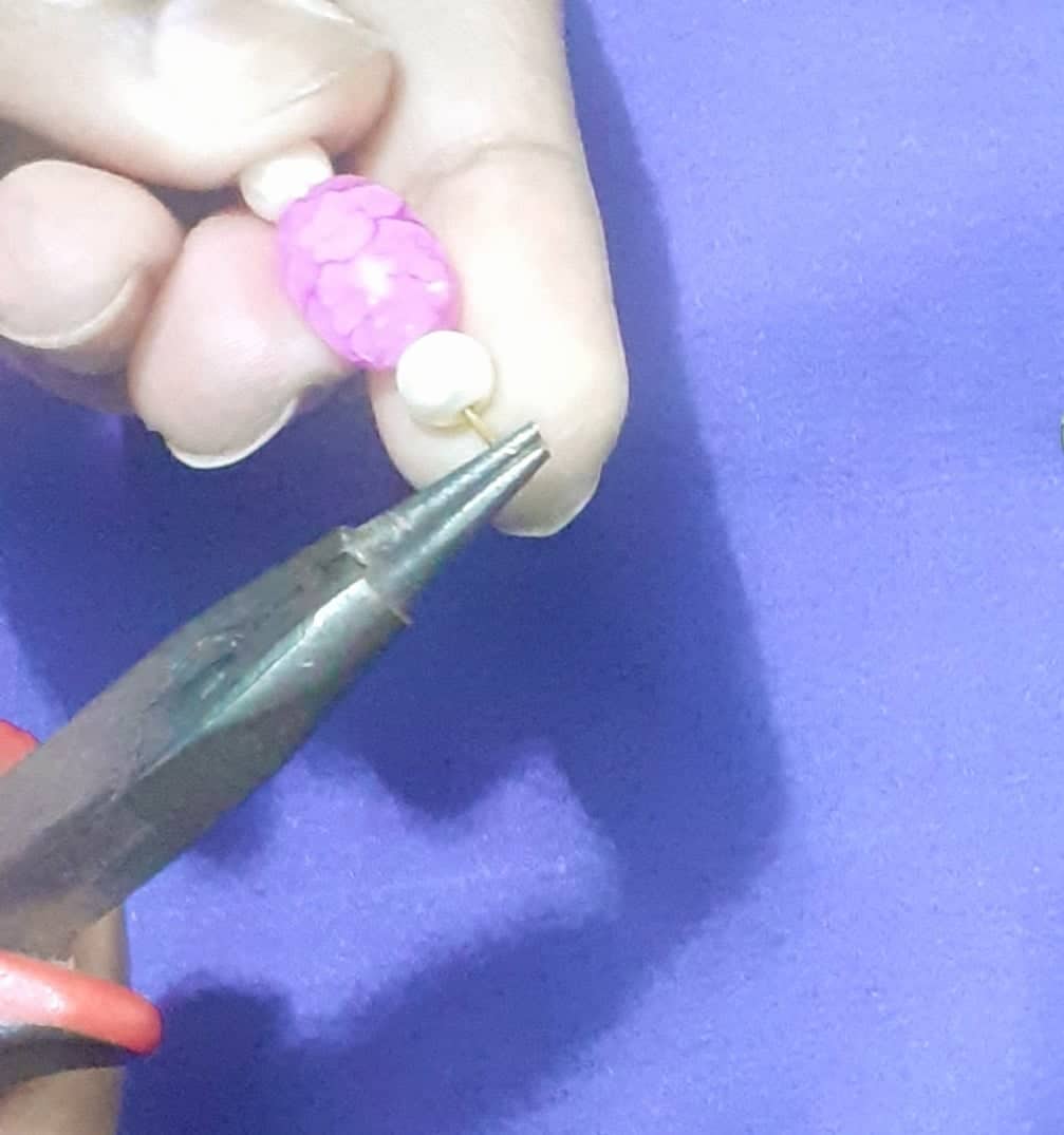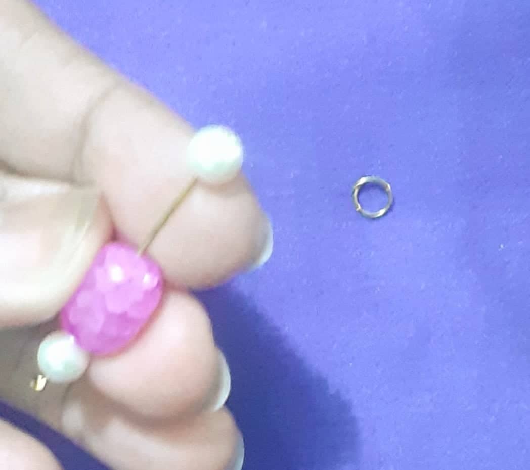 এরপর সাদা বিডস এর পরে ওভাল শেপ এর গোলাপী বিডস ঢুকিয়ে নিতে হবে। নিচের ছবির মত করে।