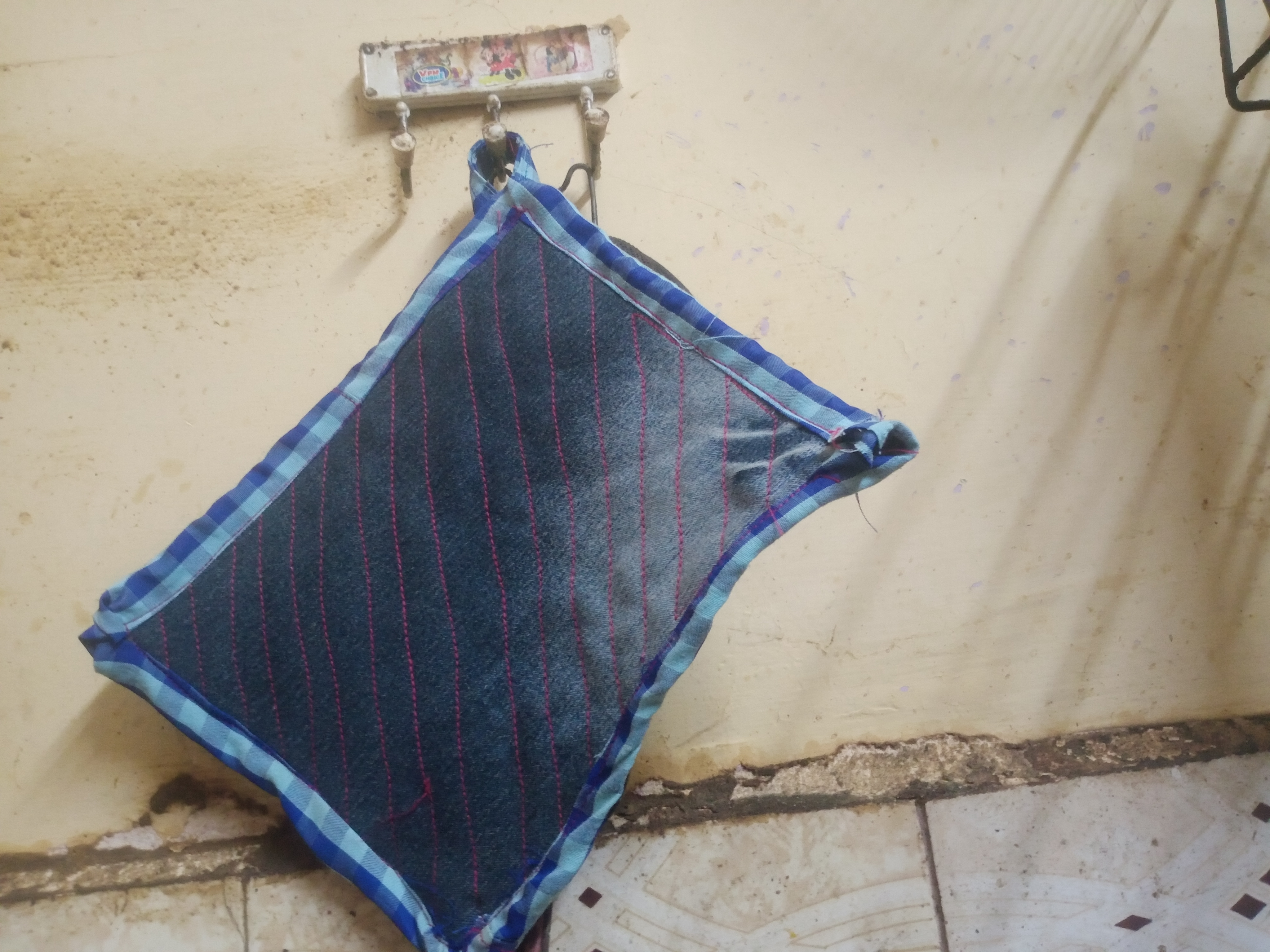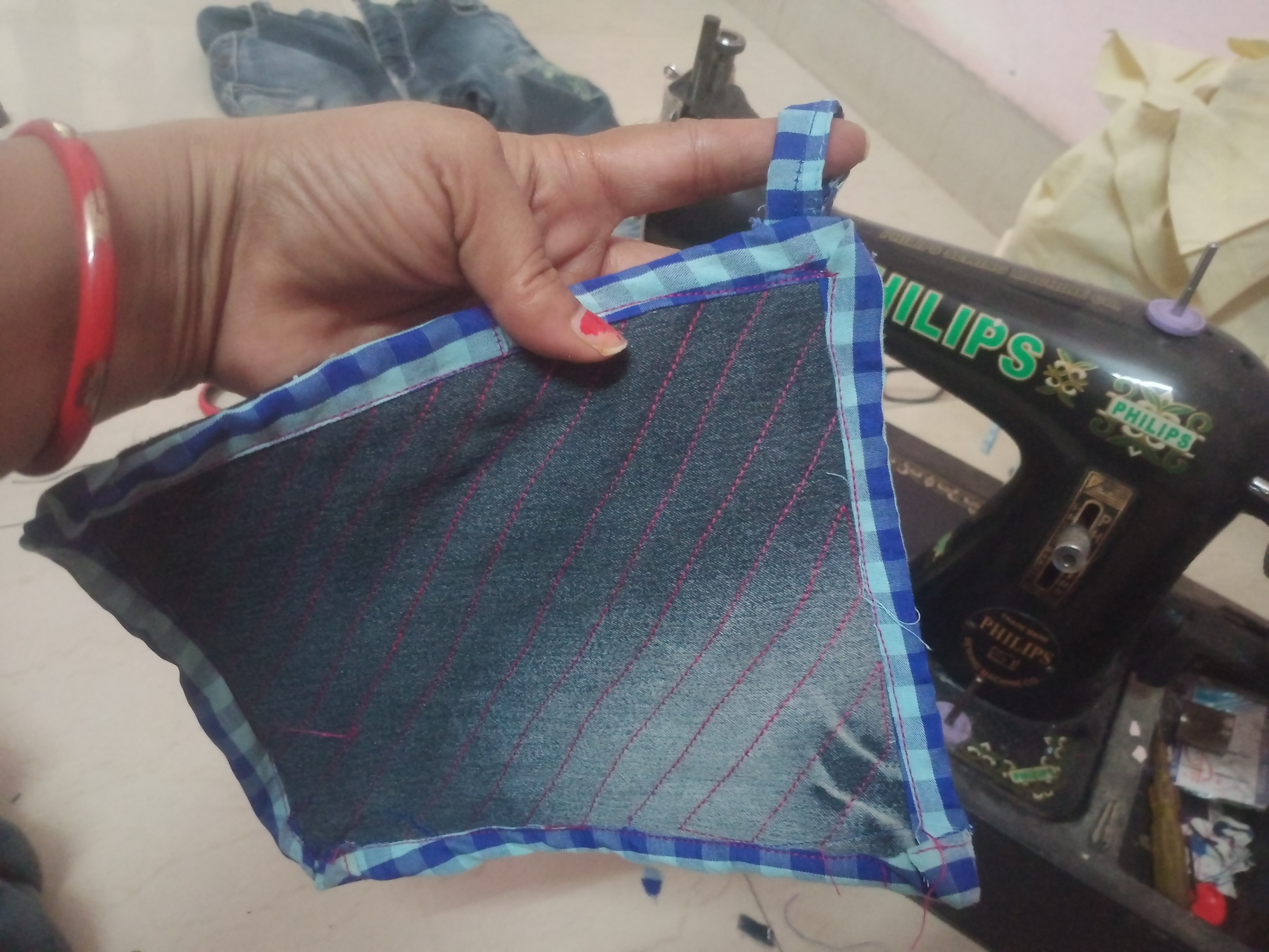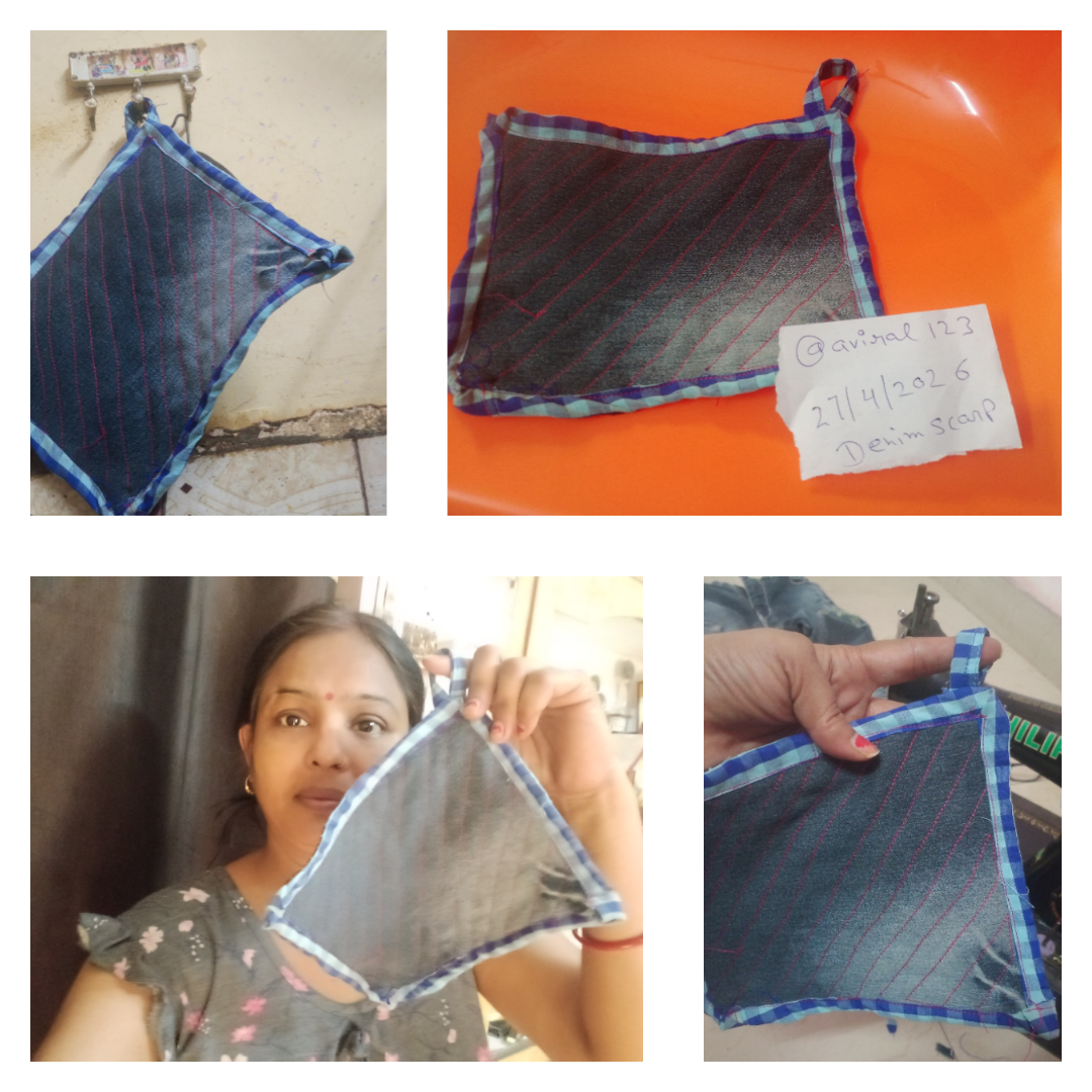 Ultimately, a brand-new, useful item is created. For this particular project, I utilized some of my children's old shirts and one of my own cotton kurtas. I paid particular attention to the choice of fabric, keeping in mind that this item would be used in the kitchen; I wanted to ensure that the material would not scorch or burn when used to handle hot pots and pans. And our hands didn't get burned either. For kitchen use, there is simply no fabric better than denim and cotton.
