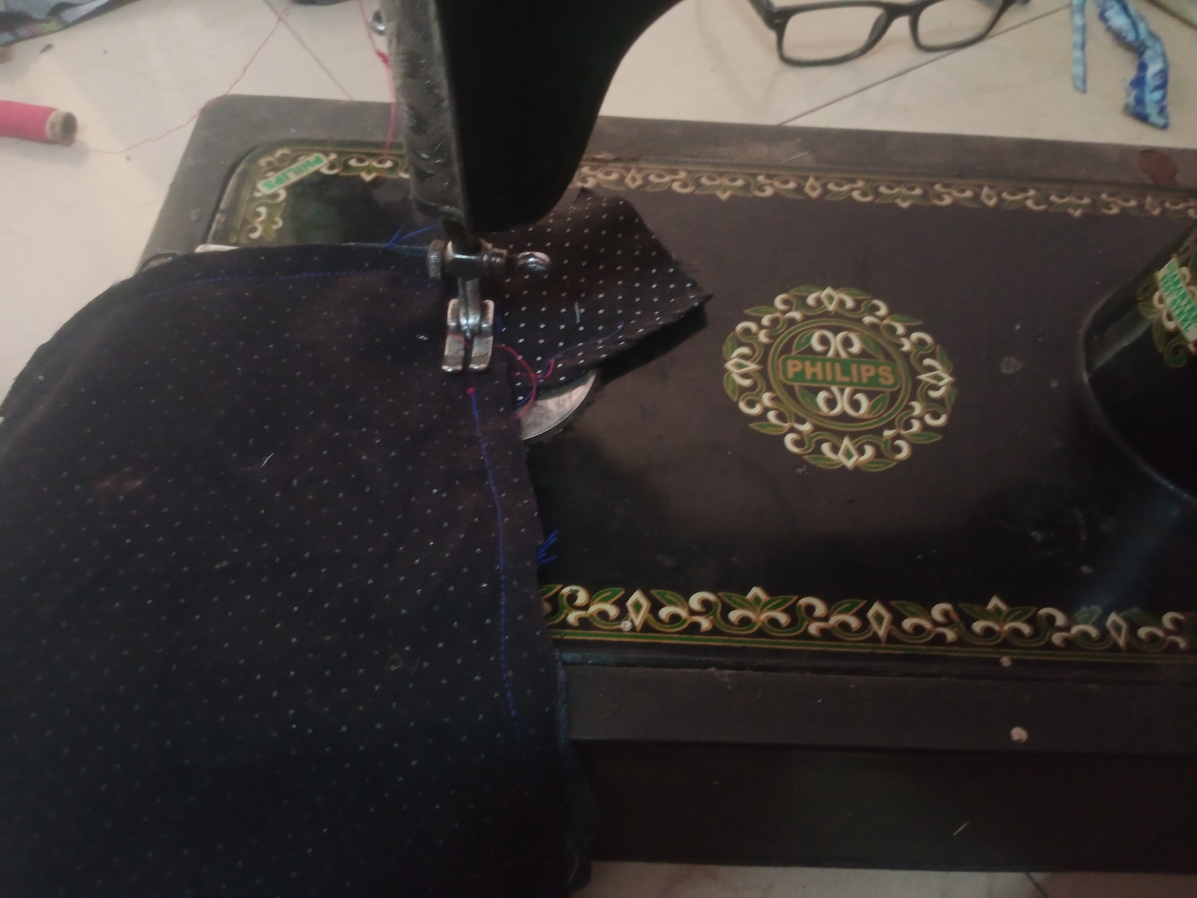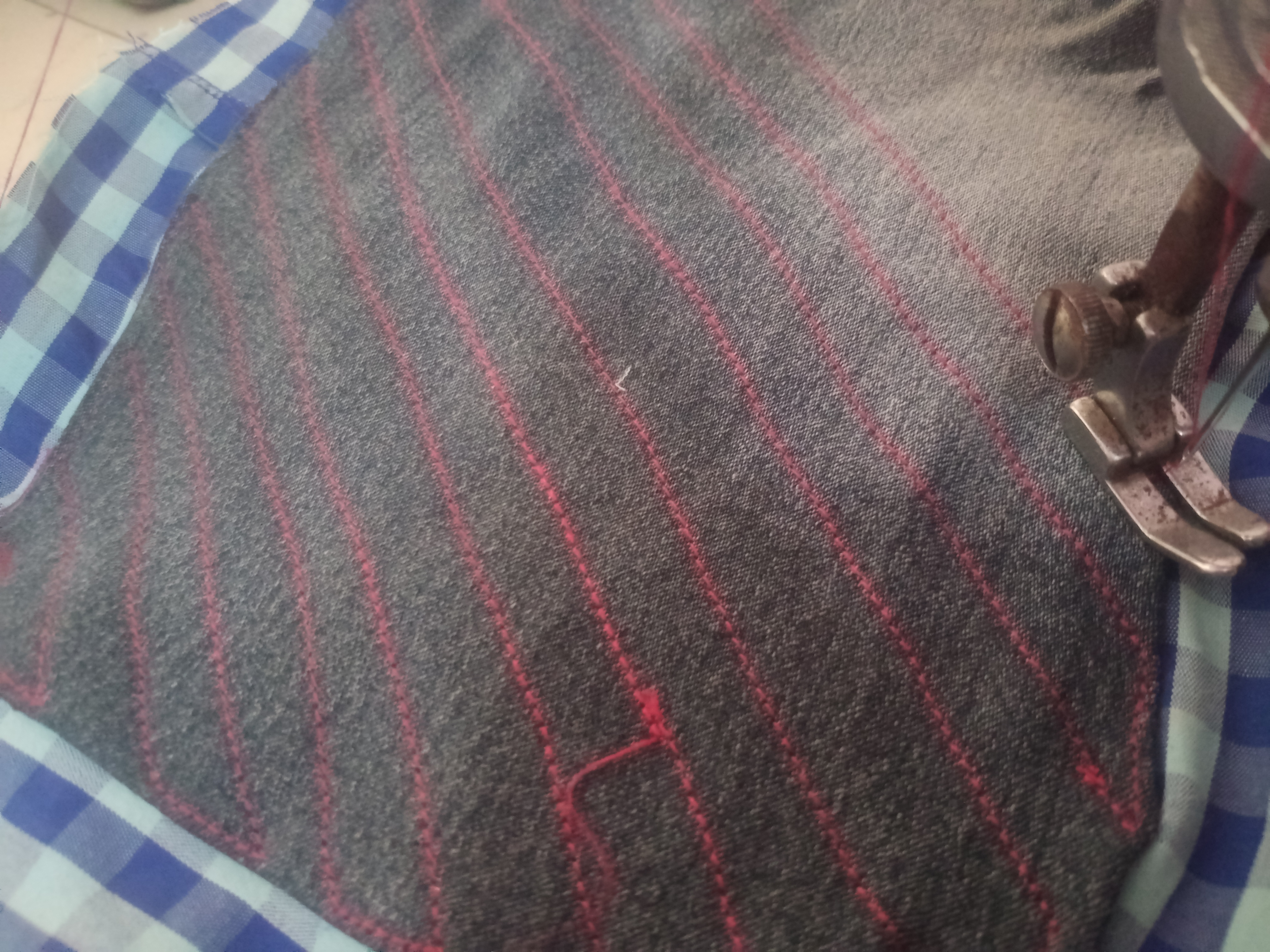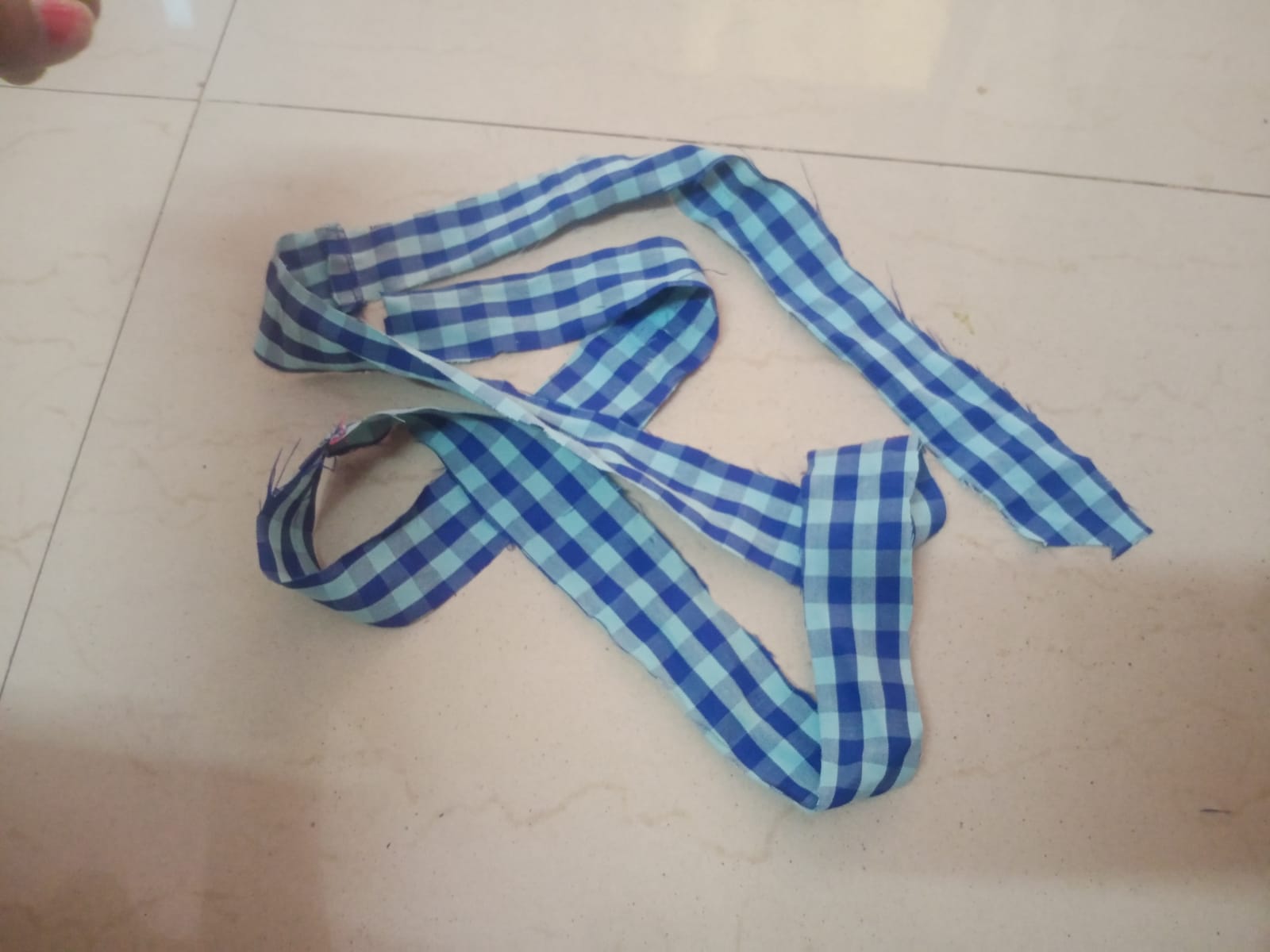 - I then took a piece of purple fabric, cut it into thin strips, and stitched them together to form a continuous length. This strip would serve two purposes: to bind the edges of the main fabric pieces and to create a hanging loop.