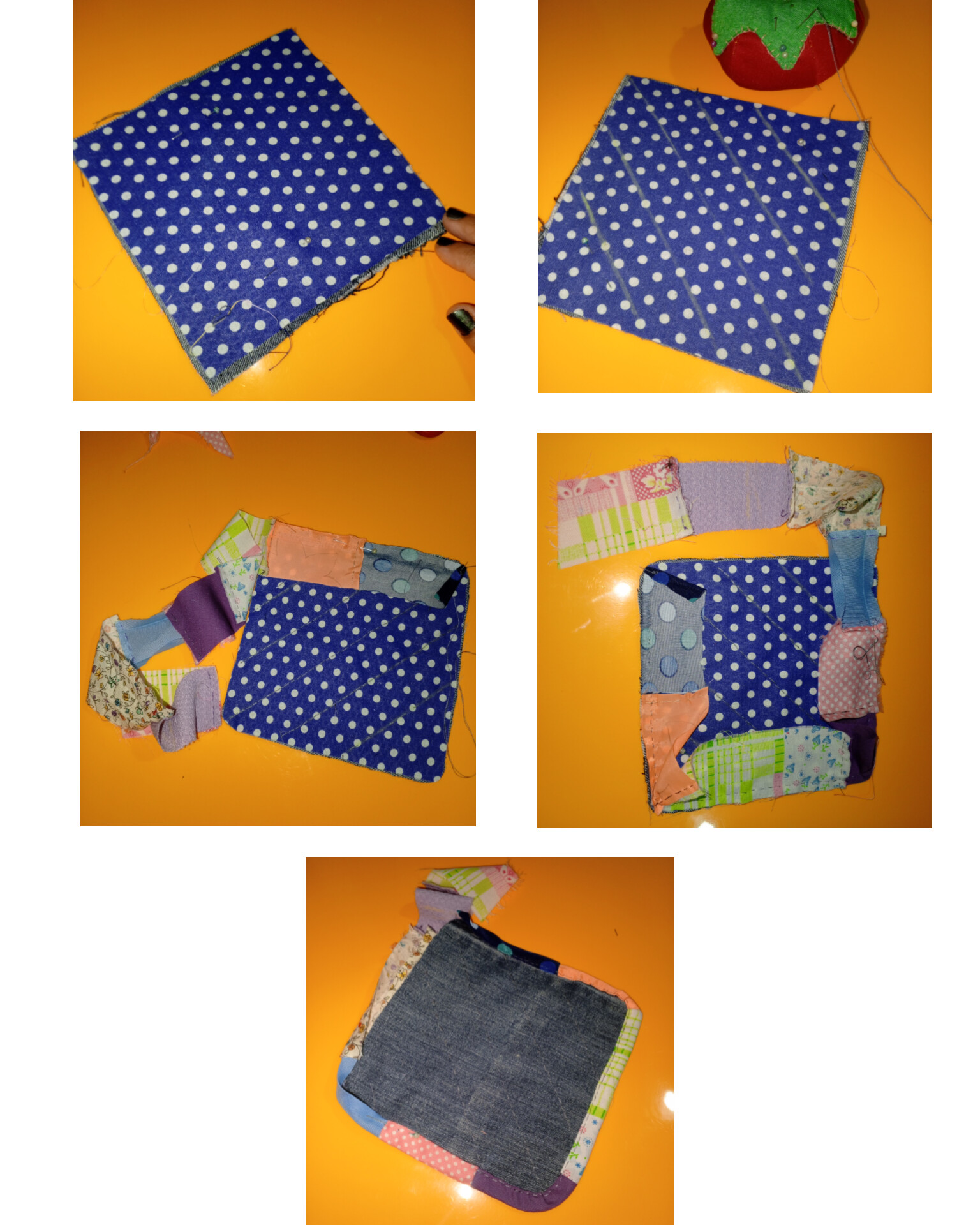 • fijar las tres piezas de tela, ubicando la de relleno entre la de algodón y la de jean,