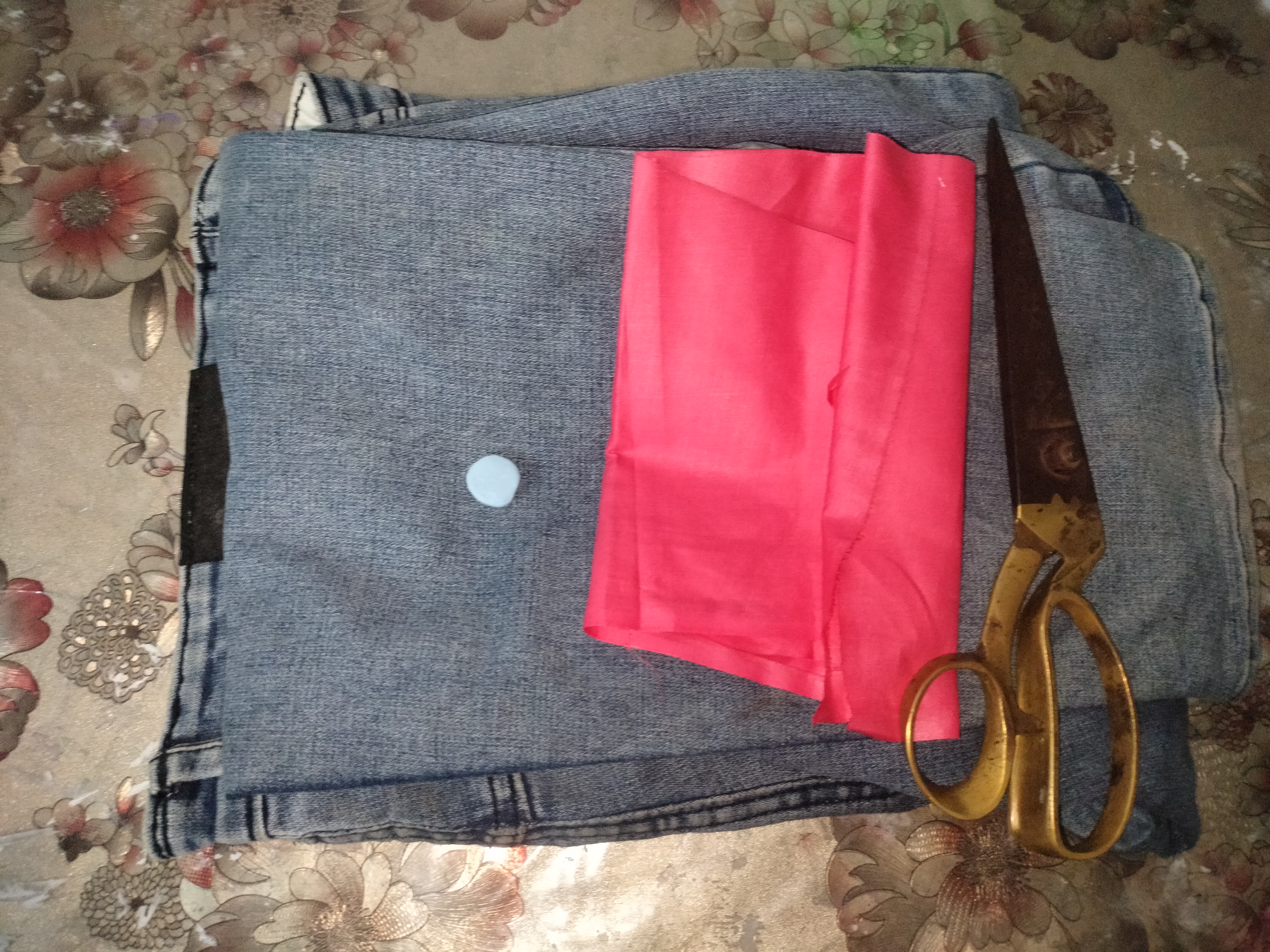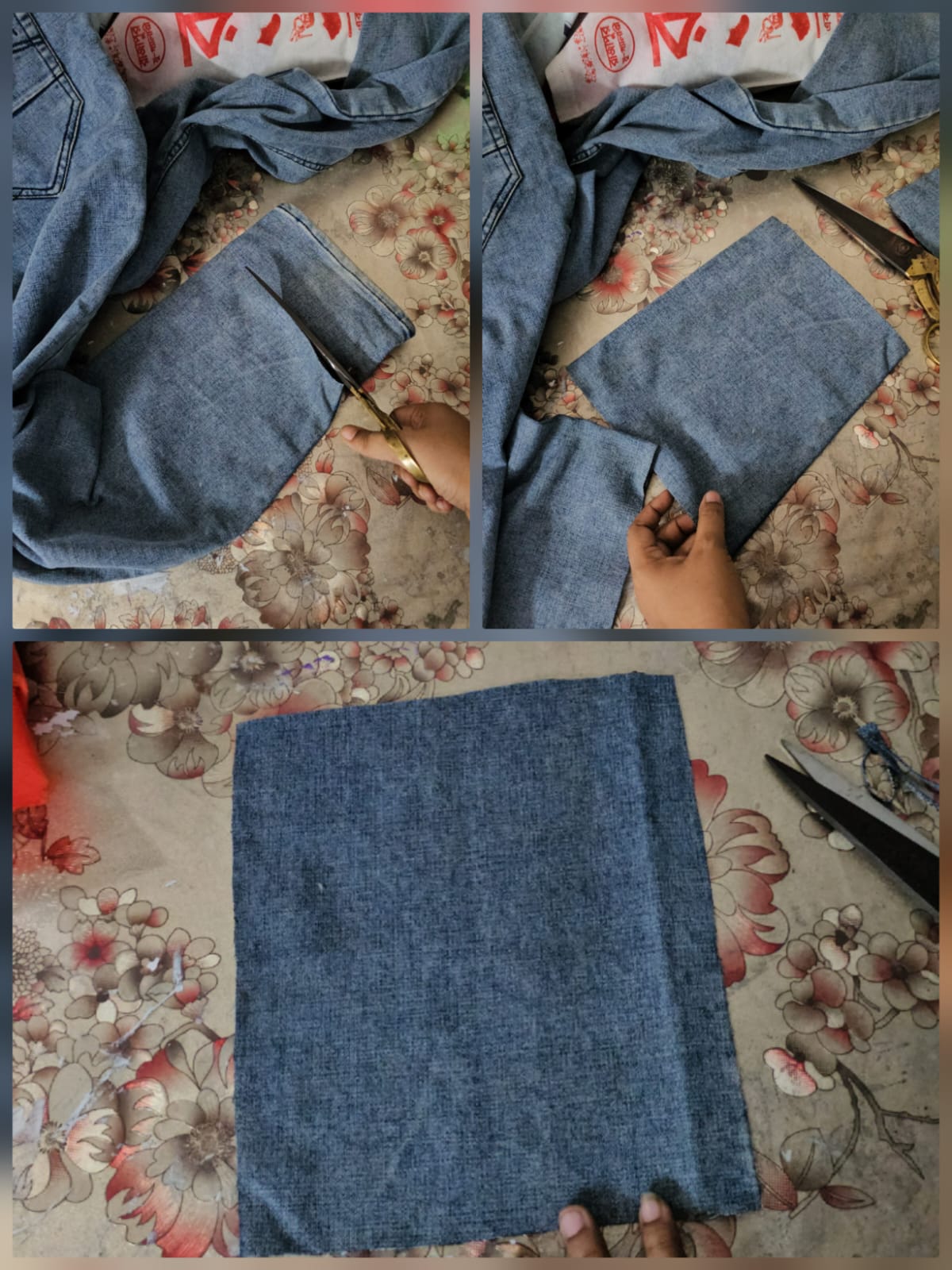 First I took an old pair of jeans. Then I cut these pants and took two pieces of cloth. I cut this cloth a little more evenly.