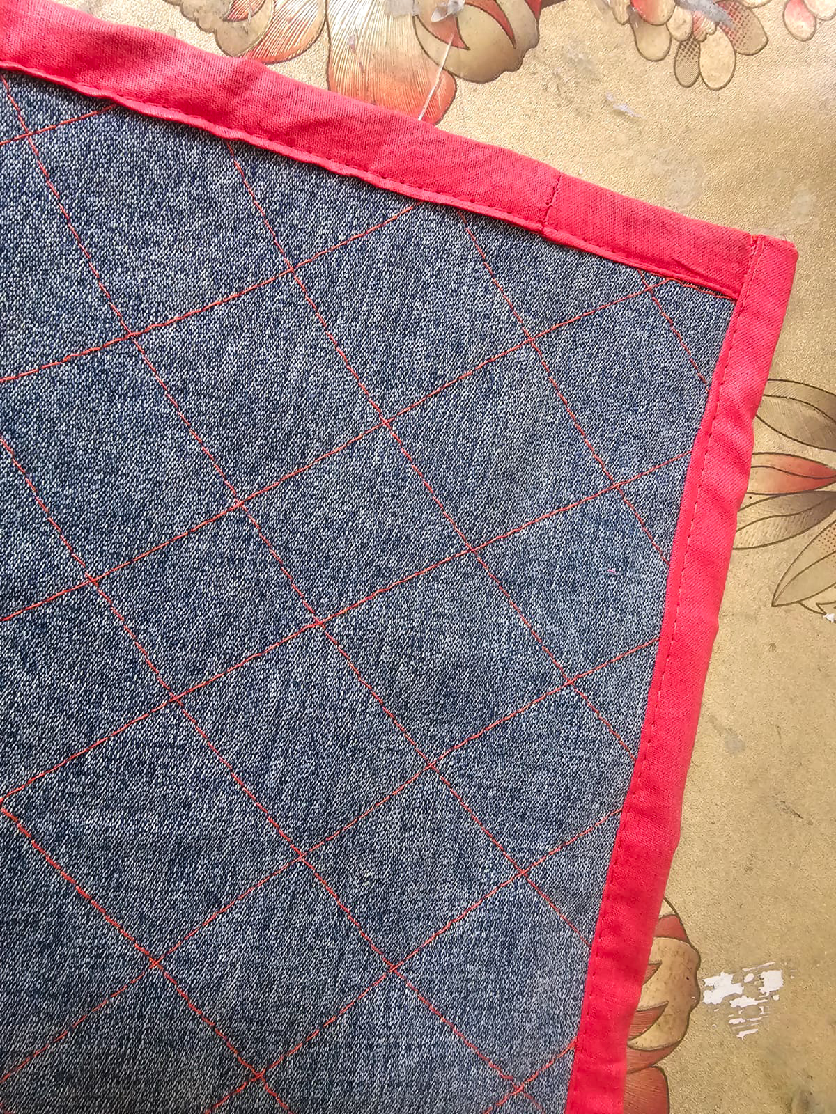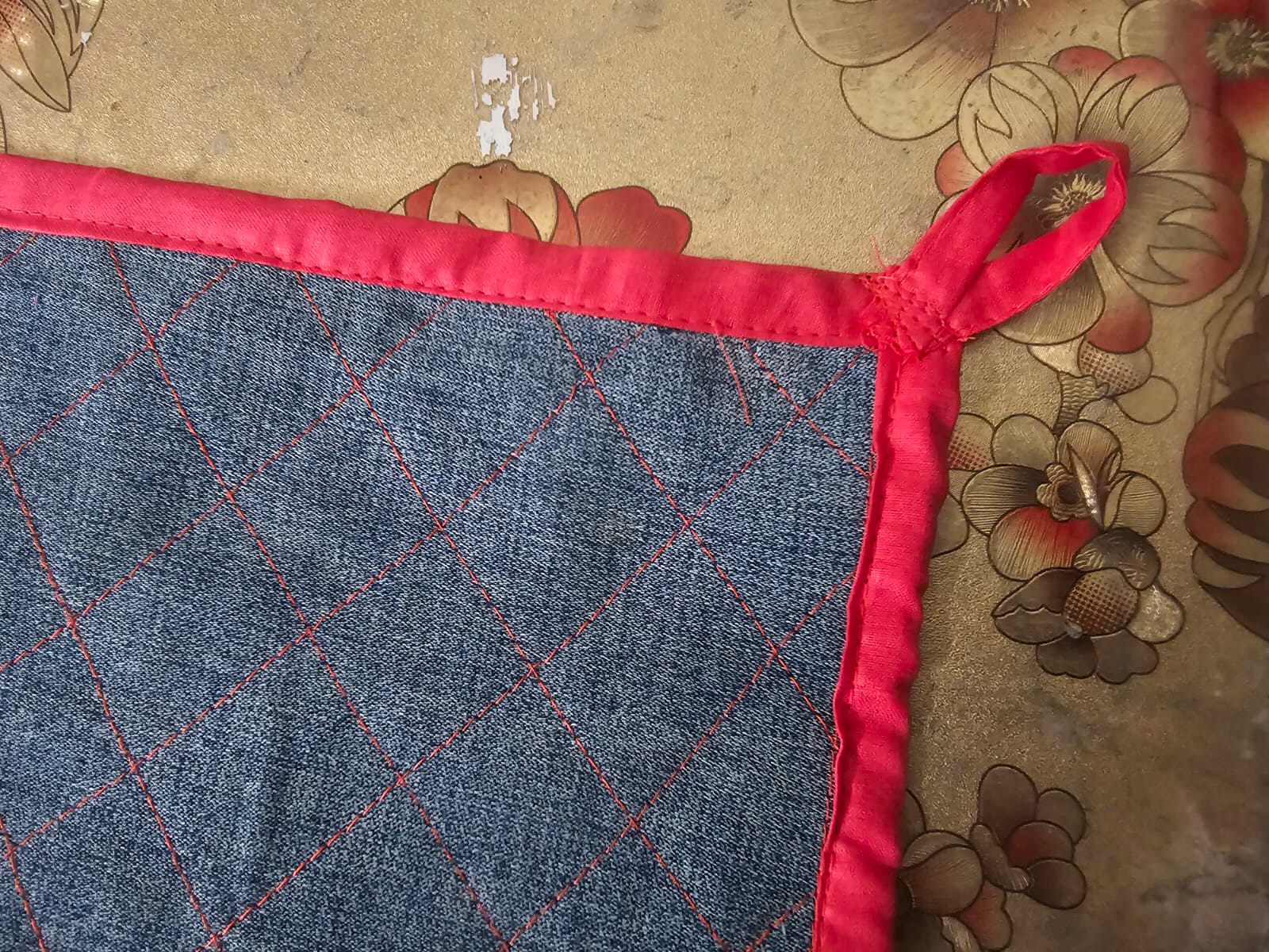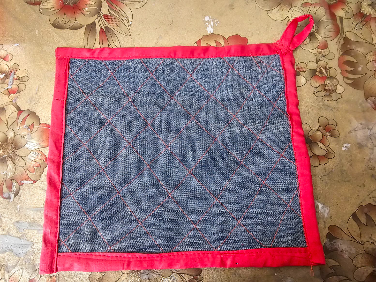 Elaboraste un lindo proyecto de agarradero de olla; me encantó mucho la combinación de ese rojo con la tela de jeans.