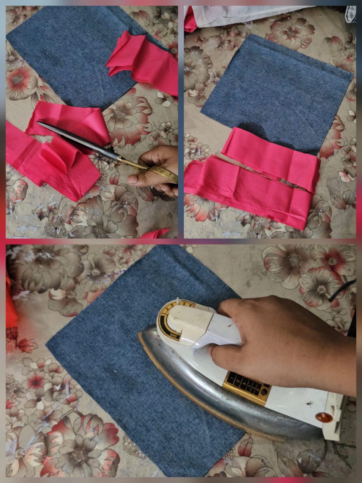 Then I took a small piece of cloth of one color. I cut this cloth evenly. In this way I cut a few pieces into small pieces. Then I ironed the cloth.