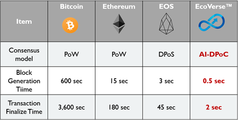 이상의 방법으로 EcoVerse™ AI-DPoC은 기존 퍼블릭 블록체인이 도저히 해결하지 못하고 있는 아래의 문제를 동시에 해결한다.