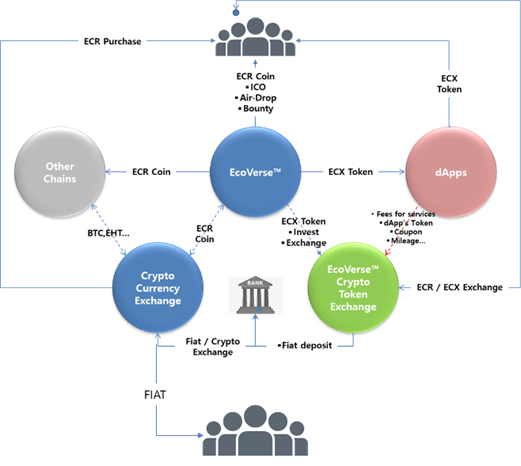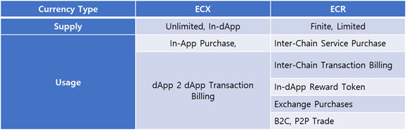 ECX는 일상적인 거래를 위한 용도로 고안되었으며, 그림에서 보다시피 거래소에서 법정화폐로 구매한 ECR 토큰으로 내부 환전소에서 교환하여 사용 할 수 있다. 이 때 재단은 ECX 로 교환된 ECR의 법정 화폐 해당 금액을 은행에 예치하여 ECX의 가치 변동성을 최소화하여 안정적 거래 수단으로 사용 할 수 있도록 보증한다. ECR은 가치를 저장하는데 사용되는 일반적인 암호 화폐이며, 거래소에서 거래할 수 있다. ECR은 블록 체인을 사용하여 서비스를 제공하려는 dApp에 대한 다양한 인증 기능을 비롯하여 dApp 자체 토큰 대신 거래용 토큰으로 사용 할 수 있도록 dApp 자체 토큰과 적정 비율로 내부 환전소에서 교환하여 사용 할 수 있도록 제공한다.