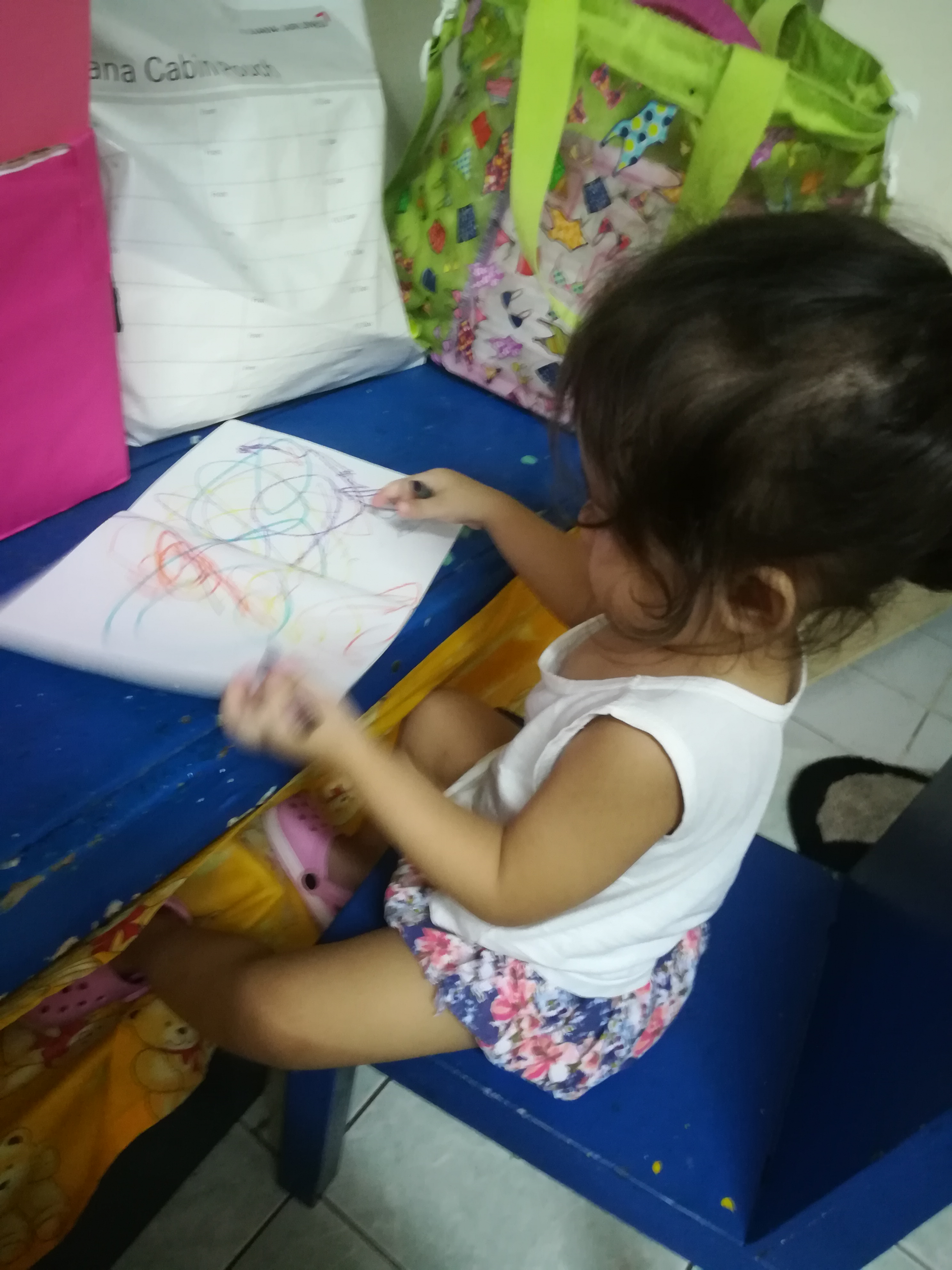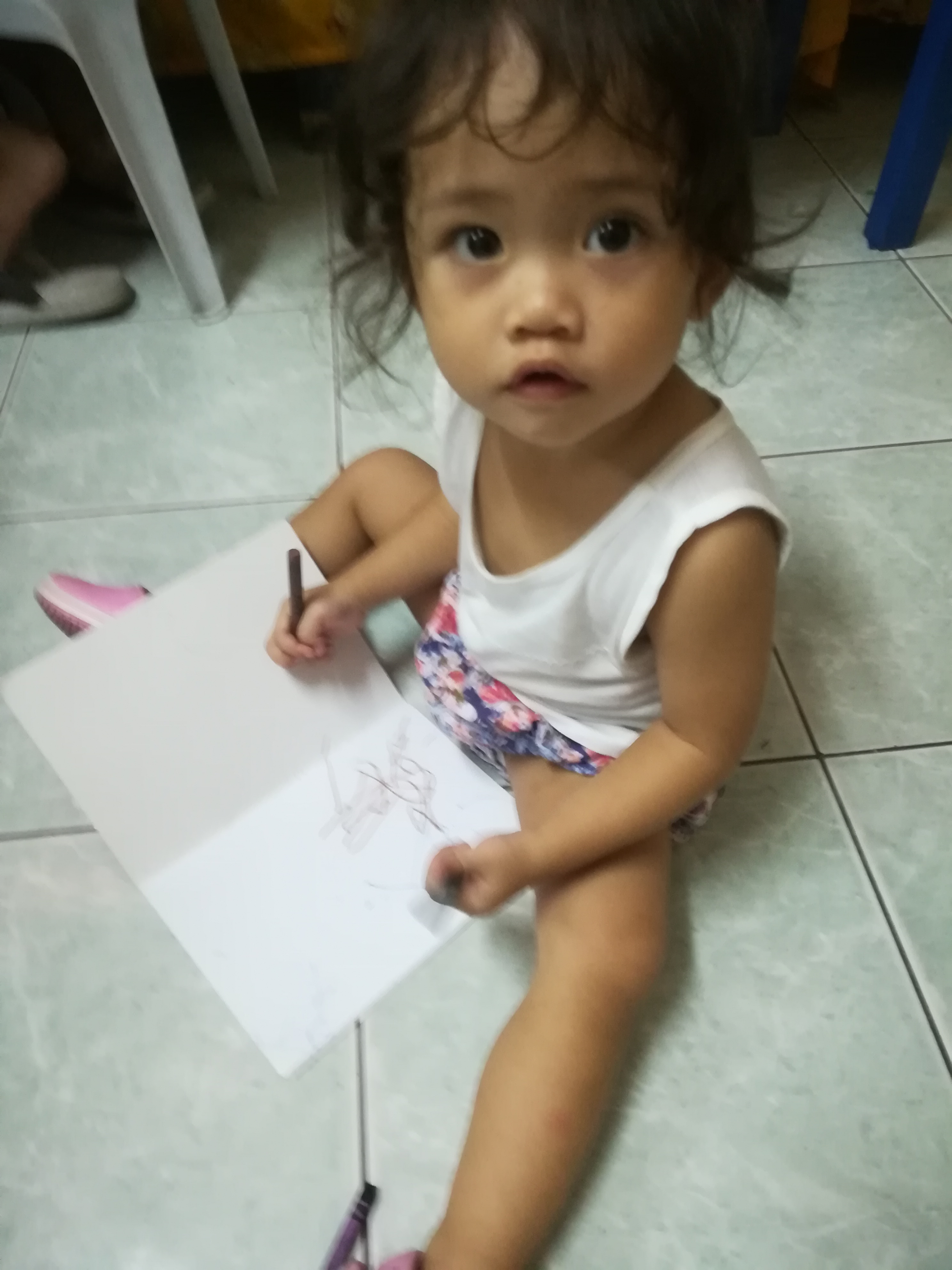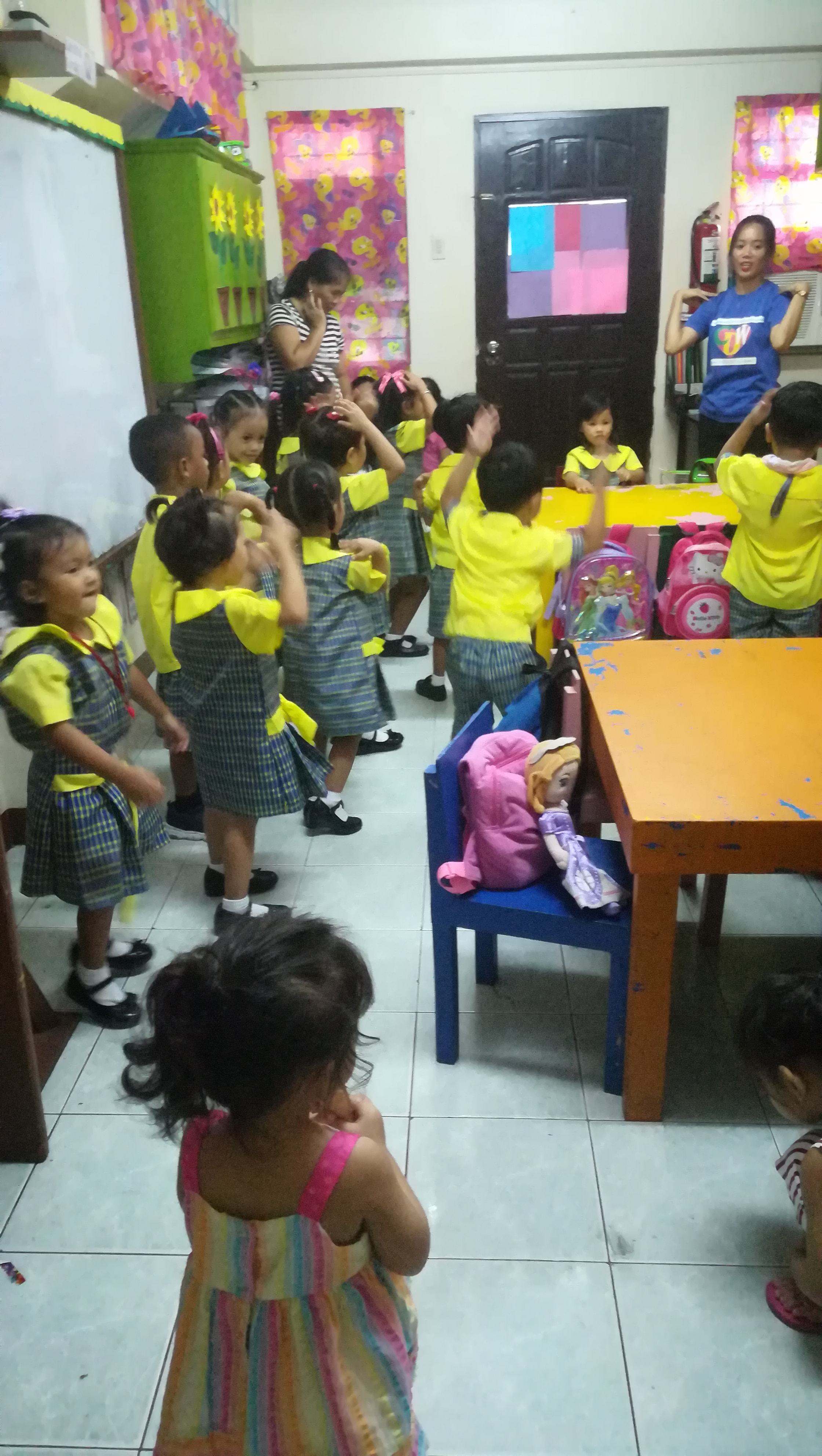 Whenever there's a dancing activity she dance , she also know now how to pray and sings the national anthem ( of course only the tune , not the words yet) She colors on her own notebook , when teacher asks students to color . She sits down on chair as if she is also enrolled 😂