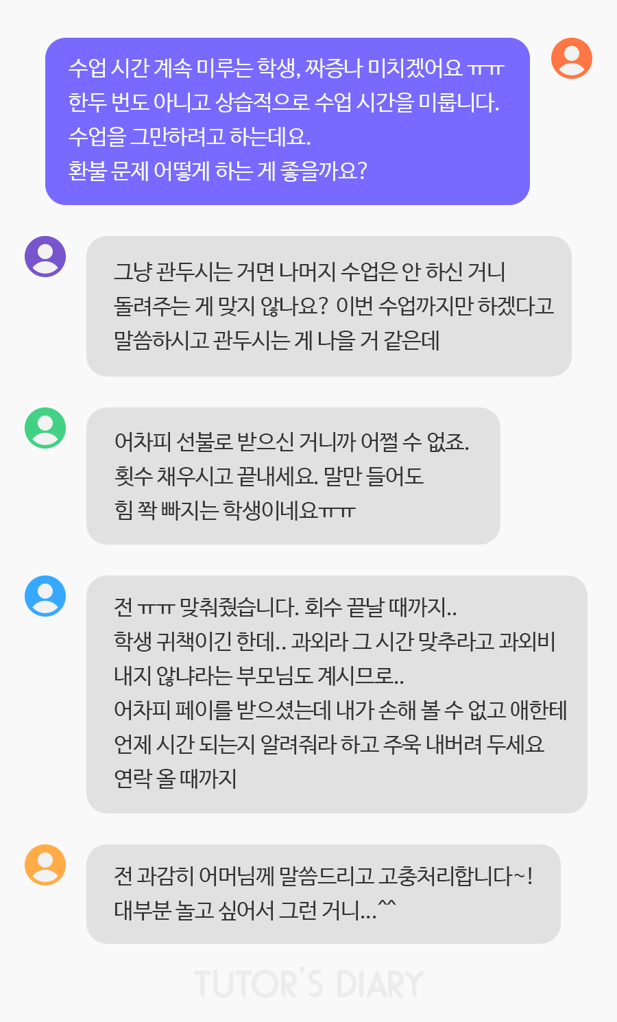 => 떳**** 선생님) 그냥 관두시는 거면 나머지 수업은 안 하신 거니 돌려주는 게 맞지 않나요? 이번 수업까지만 하겠다고 말씀하시고 관두시는 게 나을 거 같은데