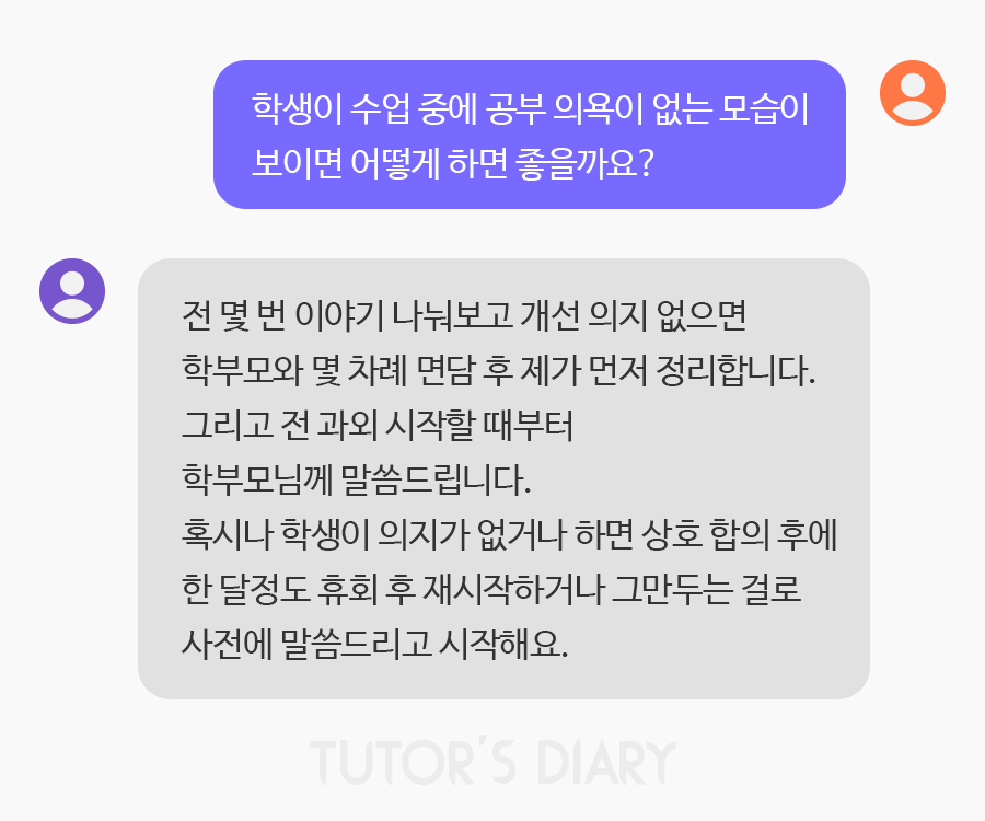 => 라**** 선생님) 전 몇 번 이야기 나눠보고 #개선의지 없으면 #학부모 와 몇 차례 면담 후 제가 먼저 정리합니다. 그리고 전 과외 시작할 때부터 학부 말씀드립니다. 혹시나 학생이 의지가 없거나 하면 상호 합의 후에 한 달 정도 휴회 후 재시작하거나 그만두는 걸로 사전에 말씀드리고 시작해요.