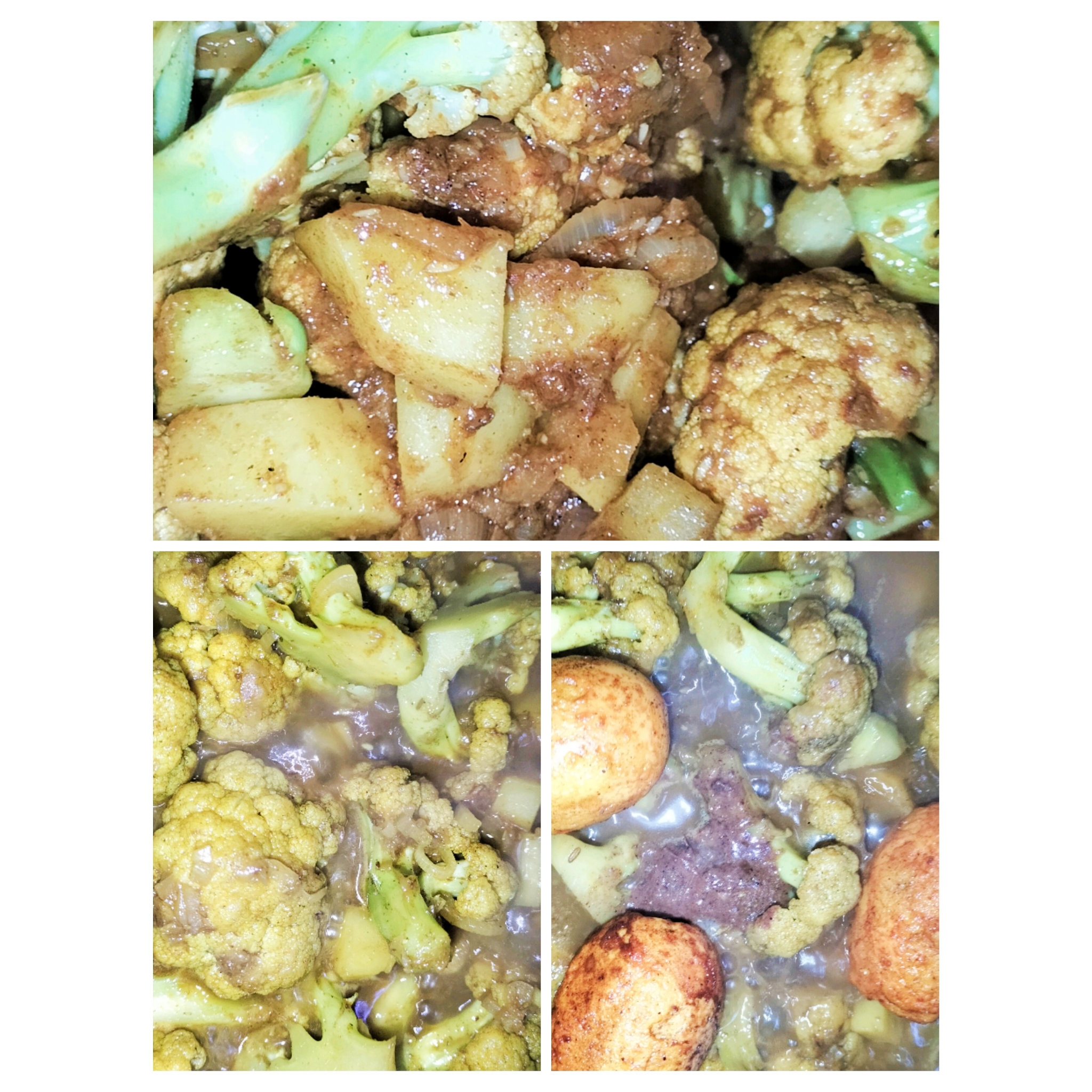এবার আমি কষানো মশলা গুলোতে ভেজে রাখা ফুলকপিও আলু গুলো দিয়েছি ও আবারও কষিয়ে নিয়েছি।