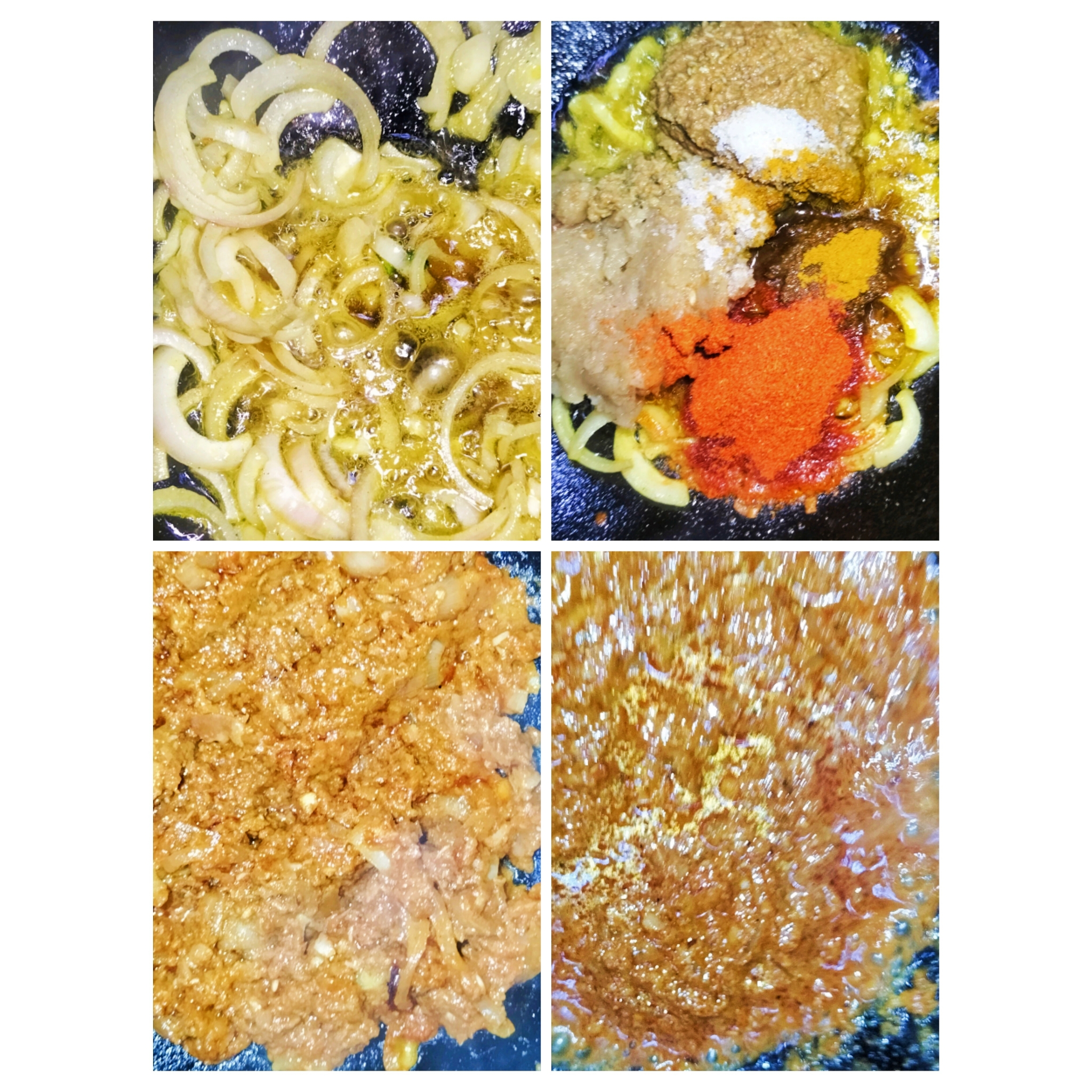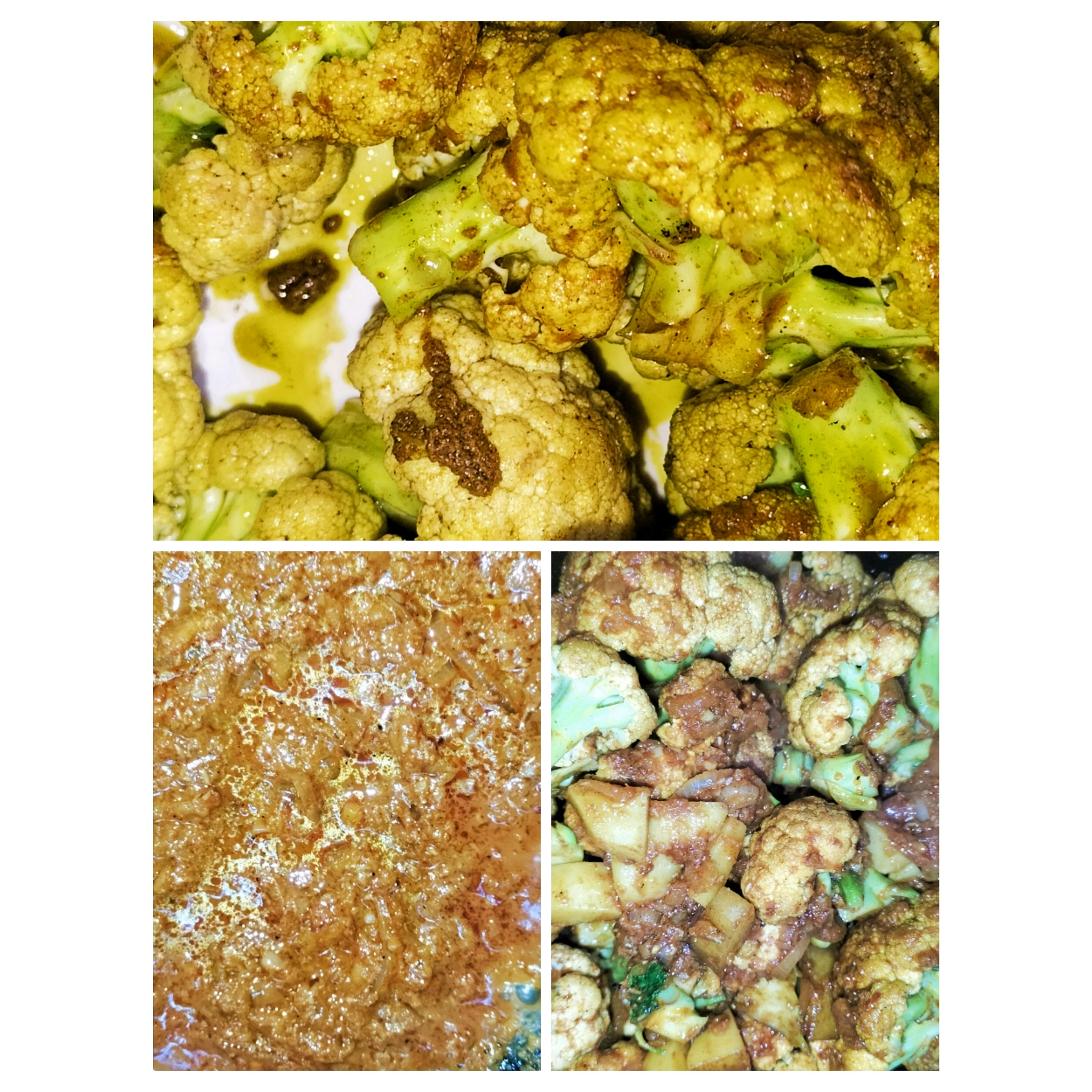 ফুলকপি,আলু ভেজে নেয়ার পর কড়াইয়ে পেয়াজ,গোটা জিরা,তেজপাতা ফোঁড়ন দিয়েছিও সেই ভাজা পেঁয়াজ গুলোতে আগে থেকে বেটে রাখা সব গুলো বাটা মশলা দিয়ে কষিয়ে নিয়েছি।