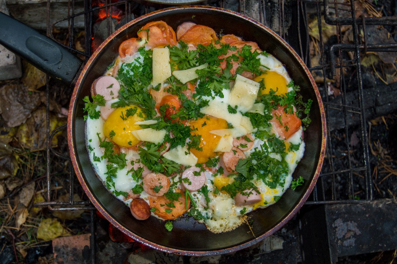 Colorchallenge thursday greenfigaro380 (60)in #eggs • 7 years ago Scrambled eggs with sausages and a lot of green species in outdoor cooking.