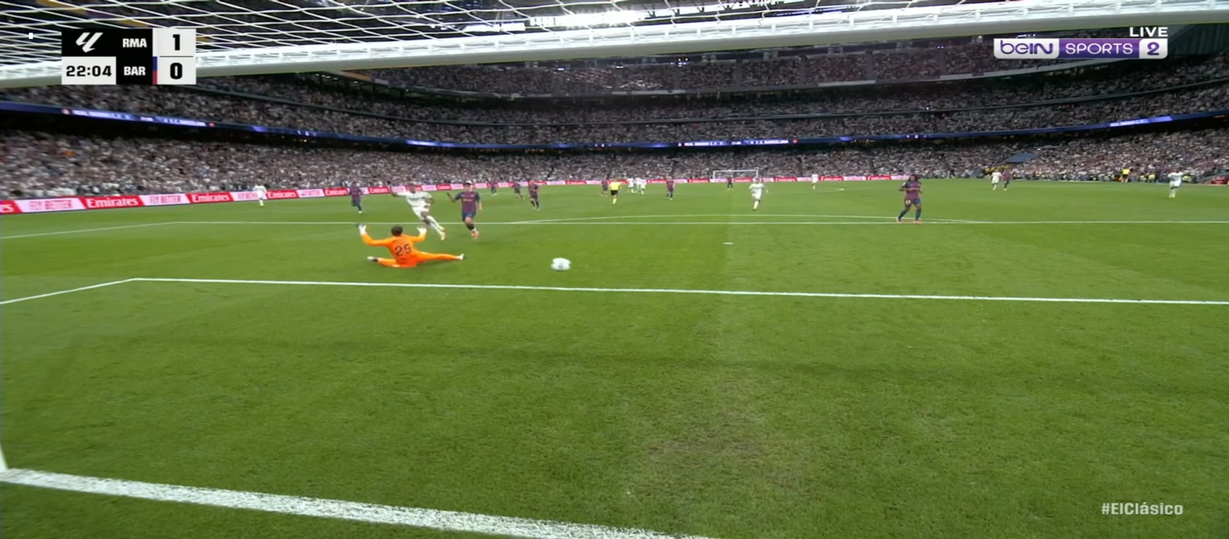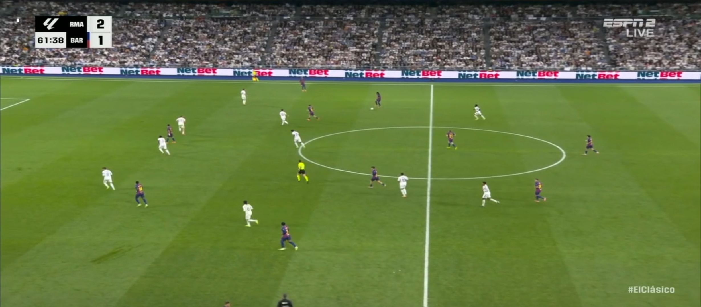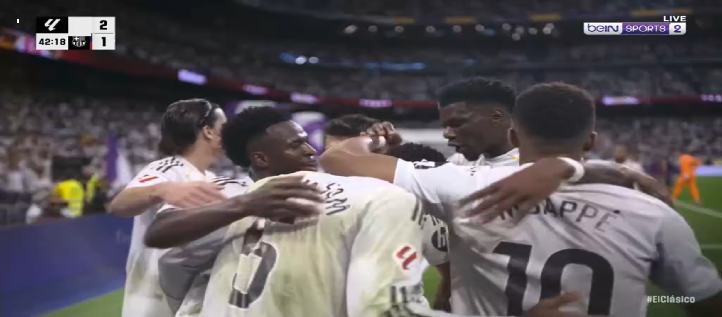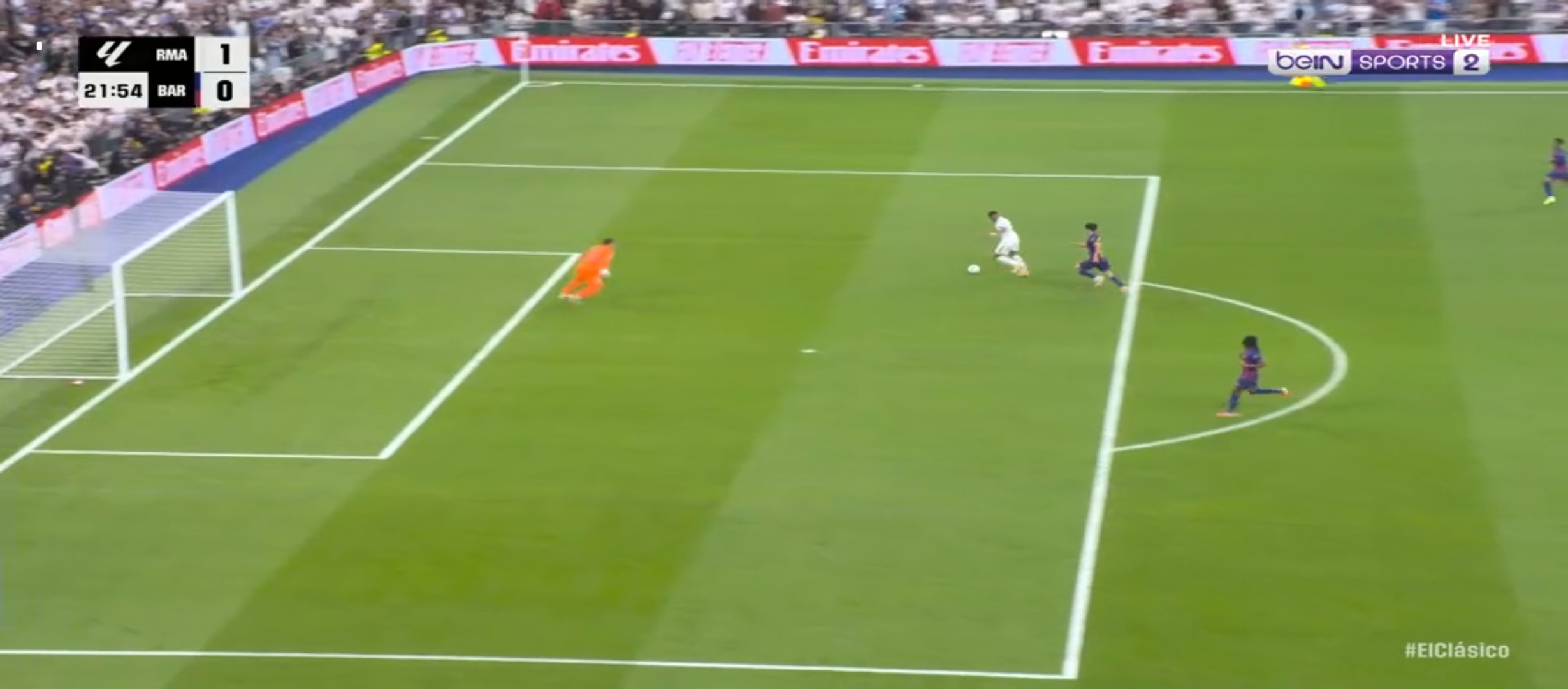 ম্যাচের ৩৮ মিনিটের সময় আর্দা গুলারের একটা ভুলে বল পেয়ে যায় বার্সেলোনা খেলোয়ার। ফলাফল গোল হজম করতে হয়। ম্যাচে সমতা চলে আসে। কিন্তু রিয়াল মাদ্রিদের খেলা অব্যাহত থাকে। মাঠের বাম প্রান্ত ভিনিসিয়াস বার্সেলোনা ডিফেন্ডার দের একেবারে নাচিয়ে ছাড়ছিল। নিজের অসাধারণ স্কিল ড্রিবলিং দিয়ে বল বের করে নিয়ে যাচ্ছিল। ফলাফল ম্যাচের ৪৩ মিনিটে ভিনিসিয়াসের বাড়িয়ে দেওয়া বল হেড দেয় মিলিটাও। সেটা চলে যায় বেলিংহামের কাছে। বেলিংহাম সহজ সুযোগ মিস করেনি। গোল করে এগিয়ে নেয় দলকে। প্রথমার্ধে ২-১ গোলে এগিয়ে থাকে রিয়াল মাদ্রিদ। দ্বিতীয়ার্ধে খেলা বেশ কিছুটা ধীরগতির হয়ে যায়। রিয়াল মাদ্রিদ খেলোয়ার রা খুব বেশি আক্রমণে যাচ্ছিল না। ফলাফল বার্সেলোনা ম্যাচে আধিপত্য বিস্তার করতে থাকে। ফলাফল বেশ কিছু সুযোগ তৈরি করলেও কোন গোল তারা দিতে পারেনি।