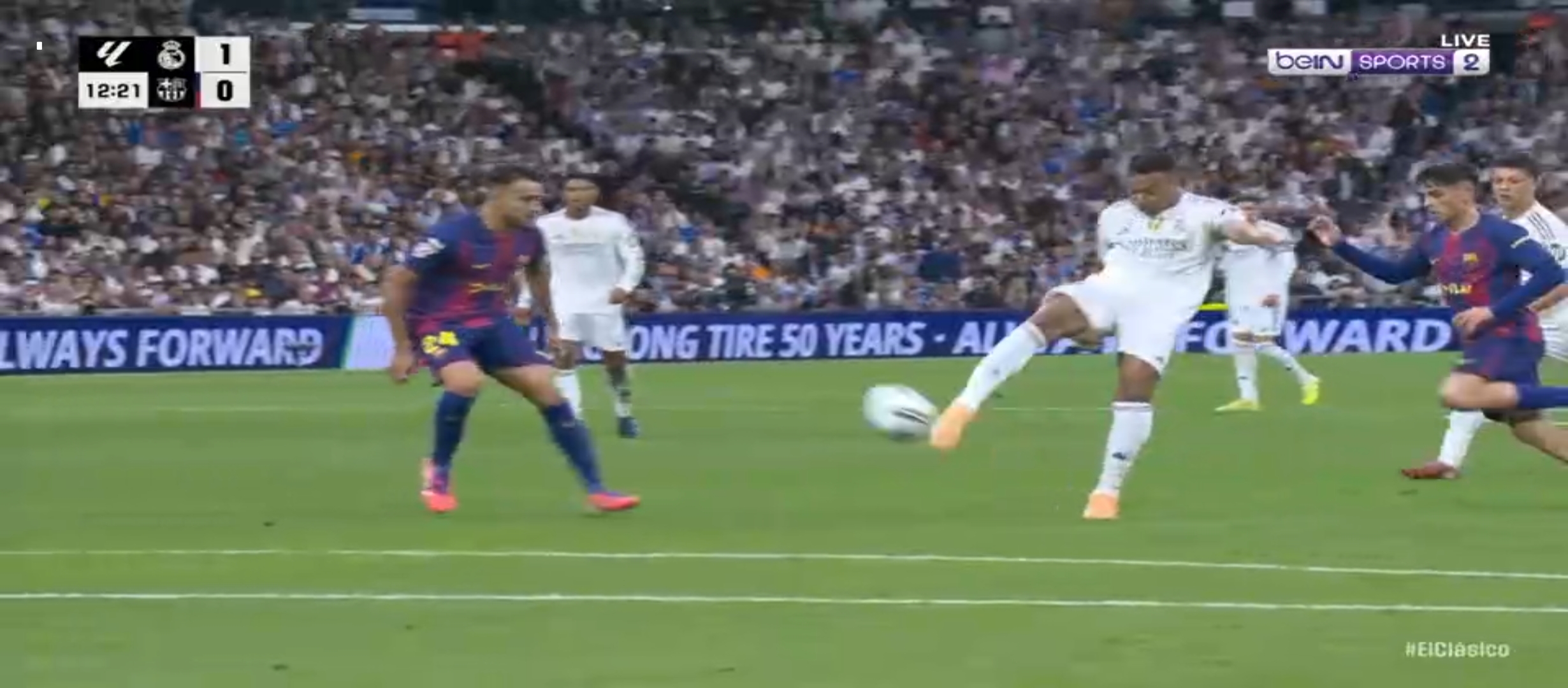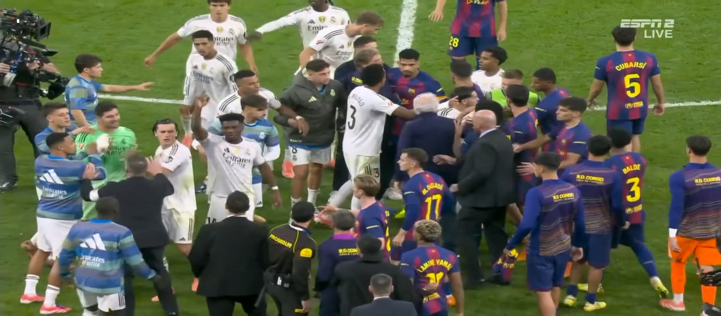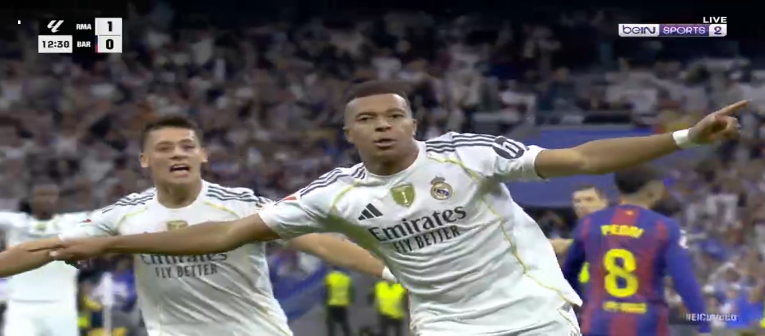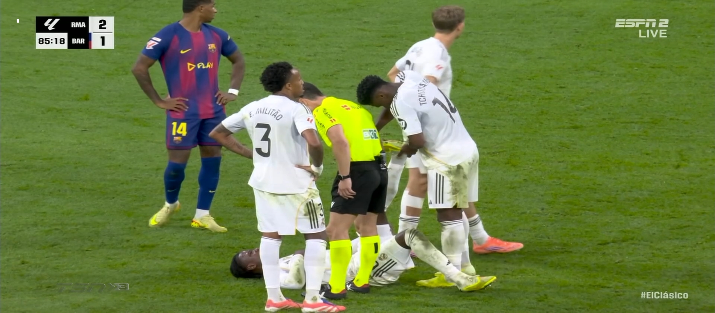 ম্যাচের ৩৮ মিনিটের সময় আর্দা গুলারের একটা ভুলে বল পেয়ে যায় বার্সেলোনা খেলোয়ার। ফলাফল গোল হজম করতে হয়। ম্যাচে সমতা চলে আসে। কিন্তু রিয়াল মাদ্রিদের খেলা অব্যাহত থাকে। মাঠের বাম প্রান্ত ভিনিসিয়াস বার্সেলোনা ডিফেন্ডার দের একেবারে নাচিয়ে ছাড়ছিল। নিজের অসাধারণ স্কিল ড্রিবলিং দিয়ে বল বের করে নিয়ে যাচ্ছিল। ফলাফল ম্যাচের ৪৩ মিনিটে ভিনিসিয়াসের বাড়িয়ে দেওয়া বল হেড দেয় মিলিটাও। সেটা চলে যায় বেলিংহামের কাছে। বেলিংহাম সহজ সুযোগ মিস করেনি। গোল করে এগিয়ে নেয় দলকে। প্রথমার্ধে ২-১ গোলে এগিয়ে থাকে রিয়াল মাদ্রিদ। দ্বিতীয়ার্ধে খেলা বেশ কিছুটা ধীরগতির হয়ে যায়। রিয়াল মাদ্রিদ খেলোয়ার রা খুব বেশি আক্রমণে যাচ্ছিল না। ফলাফল বার্সেলোনা ম্যাচে আধিপত্য বিস্তার করতে থাকে। ফলাফল বেশ কিছু সুযোগ তৈরি করলেও কোন গোল তারা দিতে পারেনি।