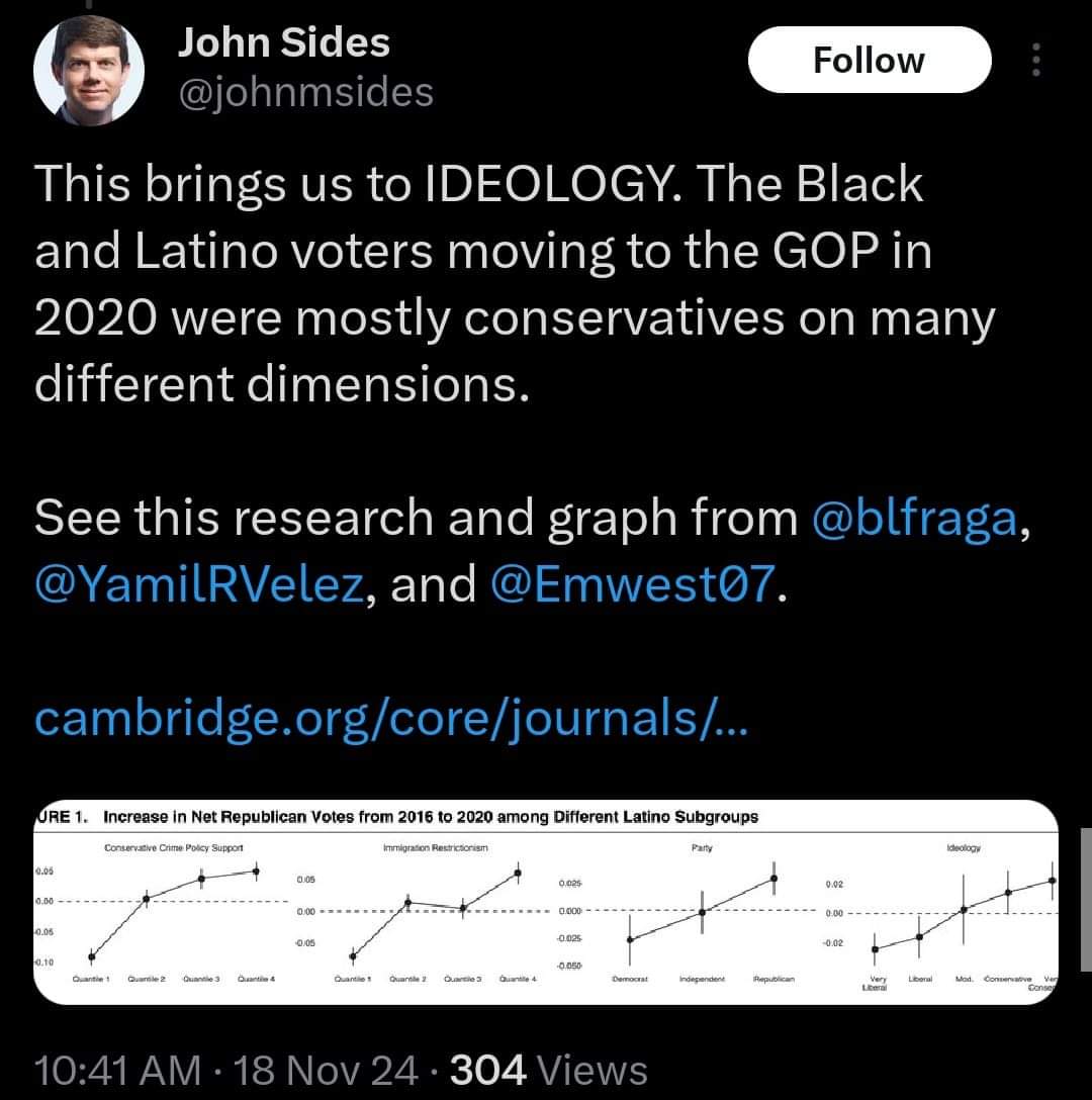 Trump is doing well among conservative Latinos and conservative Black men. The Latinos that vote for Trump are less likely to identify as Latino.