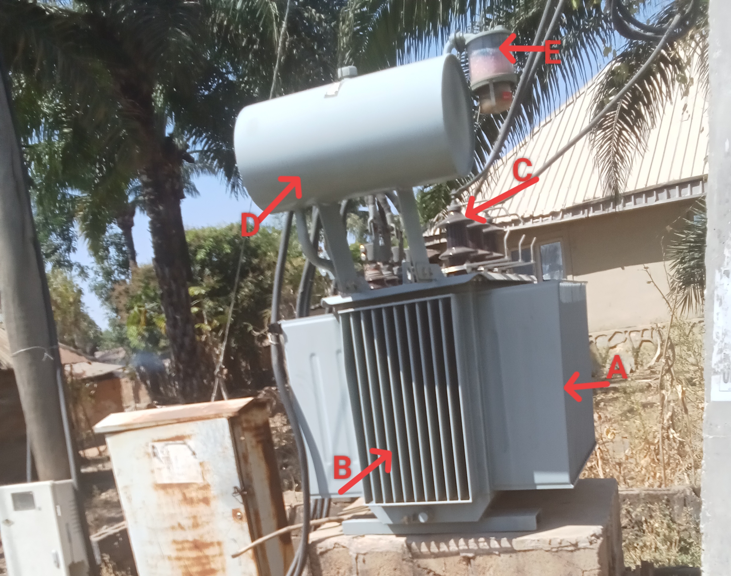 A is an indication of the transformer tank which is the main body of the transformer that houses the windings, insulating oil, and core. Another function of the transformer tank is to provide mechanical protection and prevent external interference from entering inside.B = Radiator Fins: