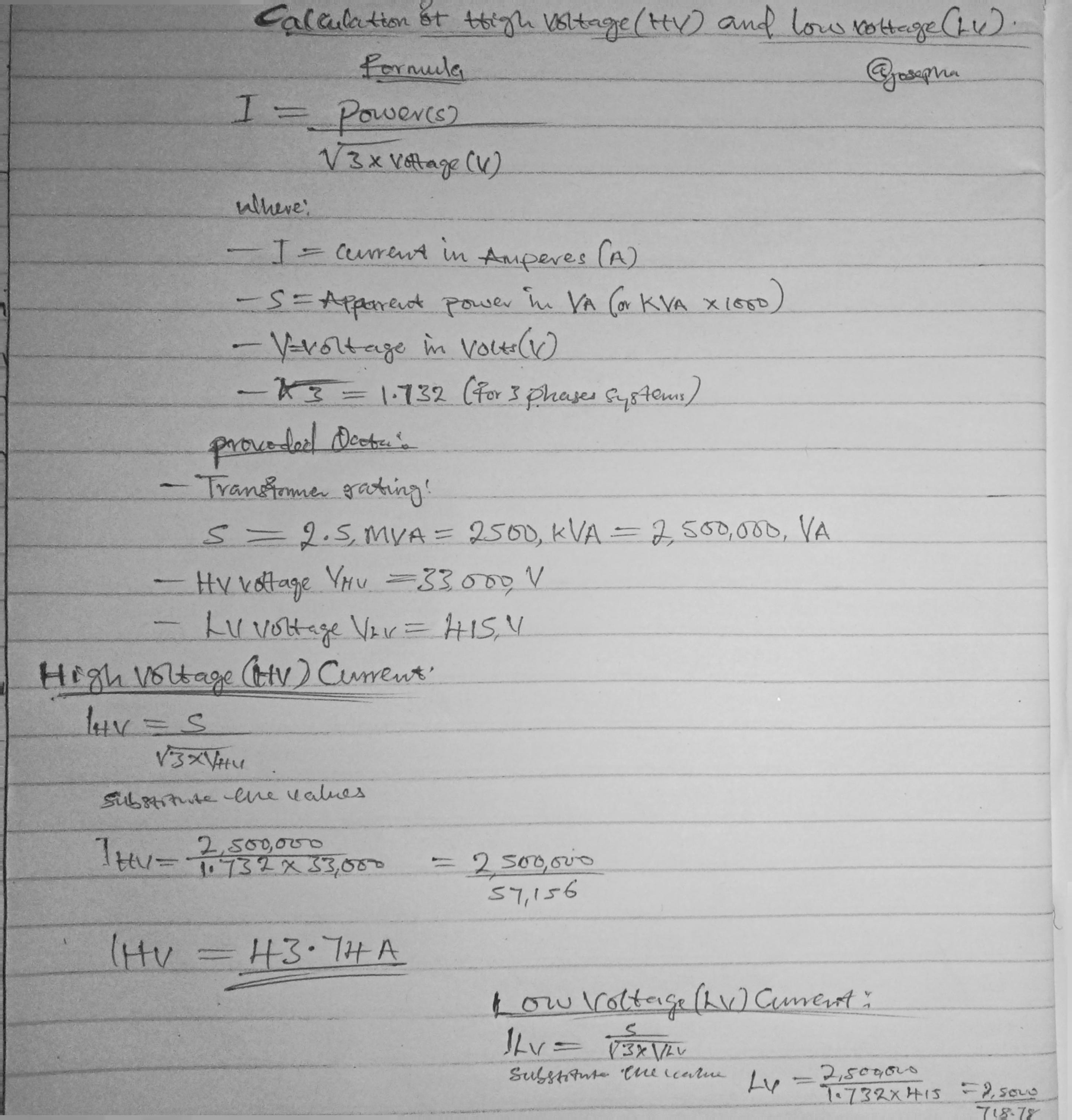 To calculate the current in the high voltage (HV) and low voltage (LV) side of the 33/0.415 kV, 2.5 MVA transformer I will have to present both the formula and work in a paper which you can see below.
