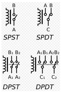 Il existe différents types de relais classés selon le nombre de points de contact et le nombre de supports de contacts. Le nombre de supports de contacts détermine ce qu’on appelle les pôles, et le nombre de points de contact détermine ce qu’on appelle les commutations. Les principaux types sont :