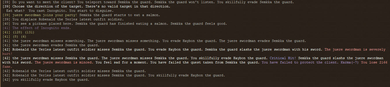 D:hadean (34)in #elona • 8 years ago (edited) .>Took an escort quest from Semkka the guard .>"My father is sick, pls halp" .>K. .>Effect of incognito ends. .>Semkka the guard killed his own father (Who is a Juere swordsman) .>"Quest failed, -7 karma :C" #madness #roleplay #what #yes