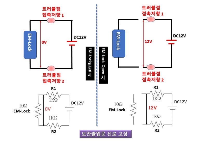 진단결과 EM-Lock의 전원공급용 지중전선로(LAN cable)가 16mm CD관에 의하여 포설되어 있는데 물이 들어가 오랫동안 물에 잠겨있어 피복의 열화현상으로 동선의 산화현상(아산화동)이 발생하여 접촉저항이 발생하여 Trouble 점이 생겼다.