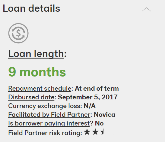 Repayments on Novica loans are tied to artisan revenue. This means that if an artisan has a good month, they will pay back more -- or less during slower months. To accommodate this, all repayments on this loan are due at the end of the loan term.