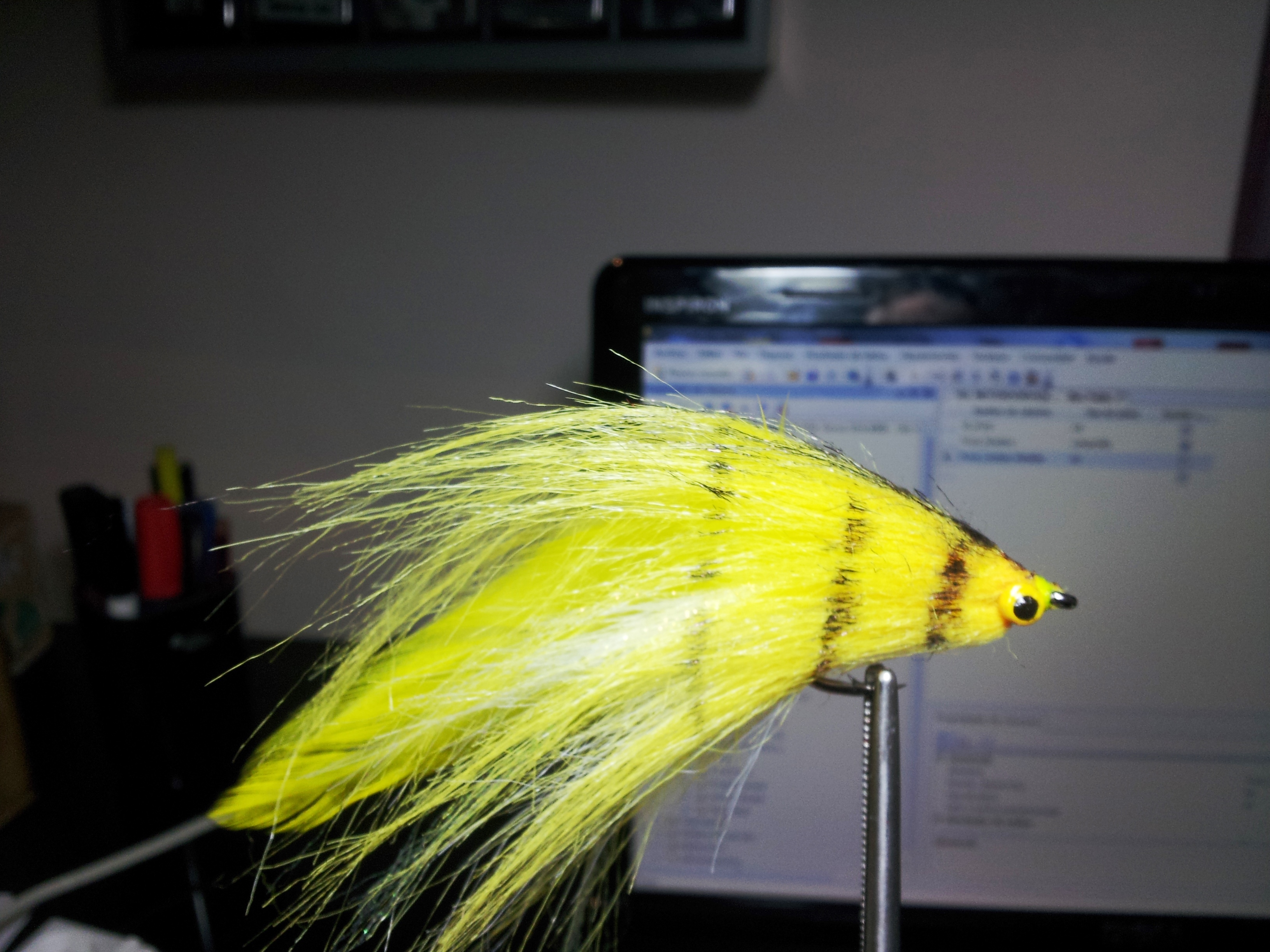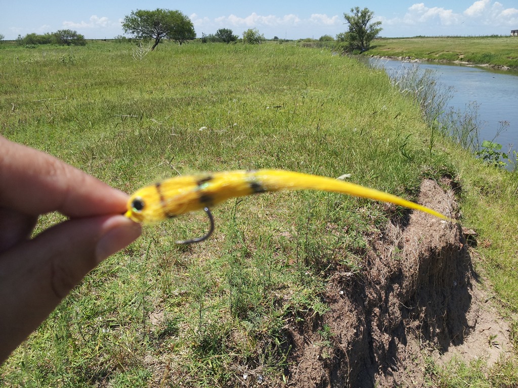 A mi me apasiona atar imitaciones y esta que les presento aquí la bauticé con el nombre de Canario en clara alusión a su color predominante, es un “streamer” es decir un artificial que imita un pequeño pez. Para su confección he utilizado pelos largos (de más de 10 centímetros) de fibras sintéticas y plumas naturales de gallina teñidas de amarillo. Los ojos son de tungsteno y pesados, en alguna época se utilizaban de plomo hasta que alguien pensó que el plomo es contaminante y su confección se sustituyó por un material que no contamina.