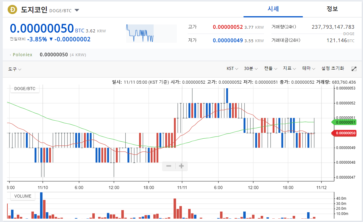 5 . 업비트 기준 도지코인 시세는 원화로 3.62 원 비트코인으로 50사토시이네요 ^^;;