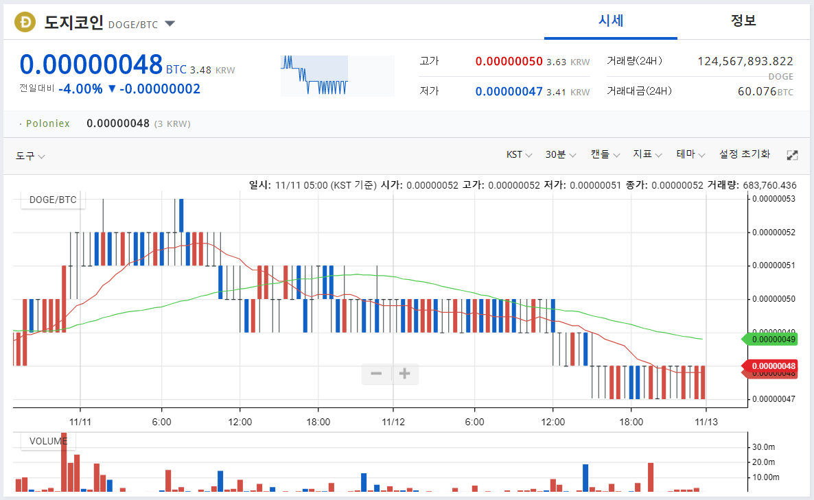 5 . 업비트 기준 도지코인 시세는 원화로 3.48 원 비트코인으로 48사토시이네요 ^^;;