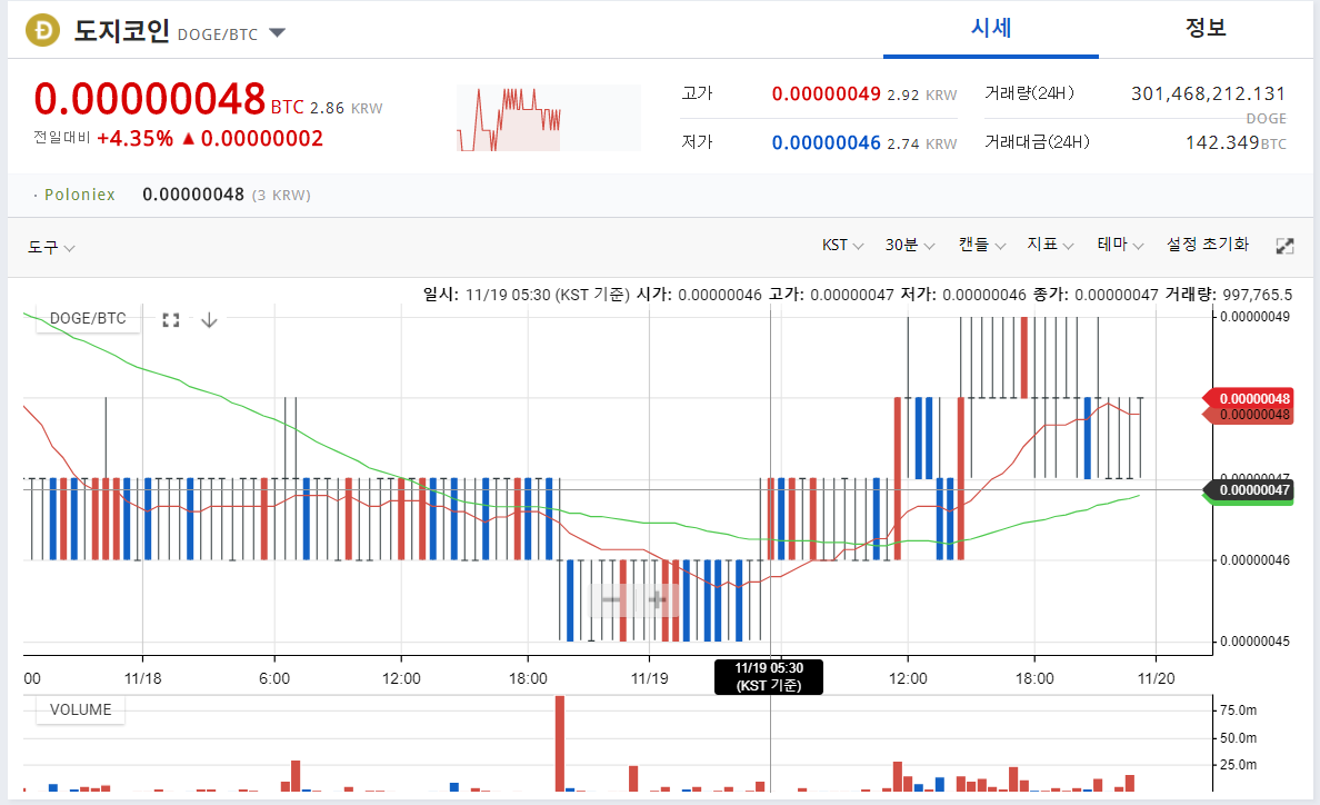5 . 업비트 기준 도지코인 시세는 원화로 2.88 원 비트코인으로 45사토시이네요 ^^;;