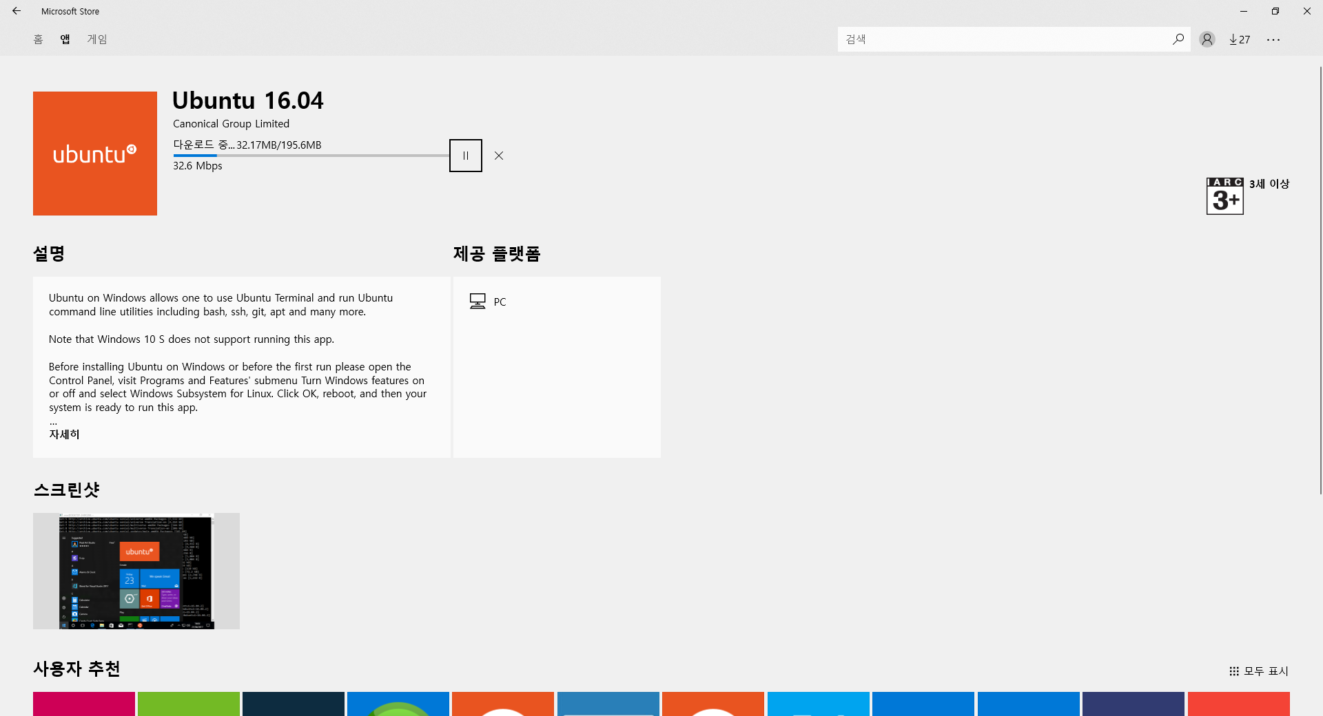 MS store에서 현재 우분투 18.04, 16.04 버전을 설치가 가능합니다.