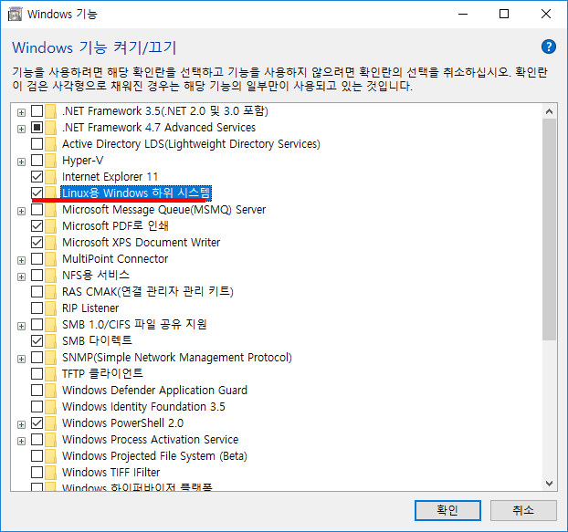 [Linux용 Windows 하위 시스템] 체크 후 확인하시고 리부팅 하시면 됩니다.