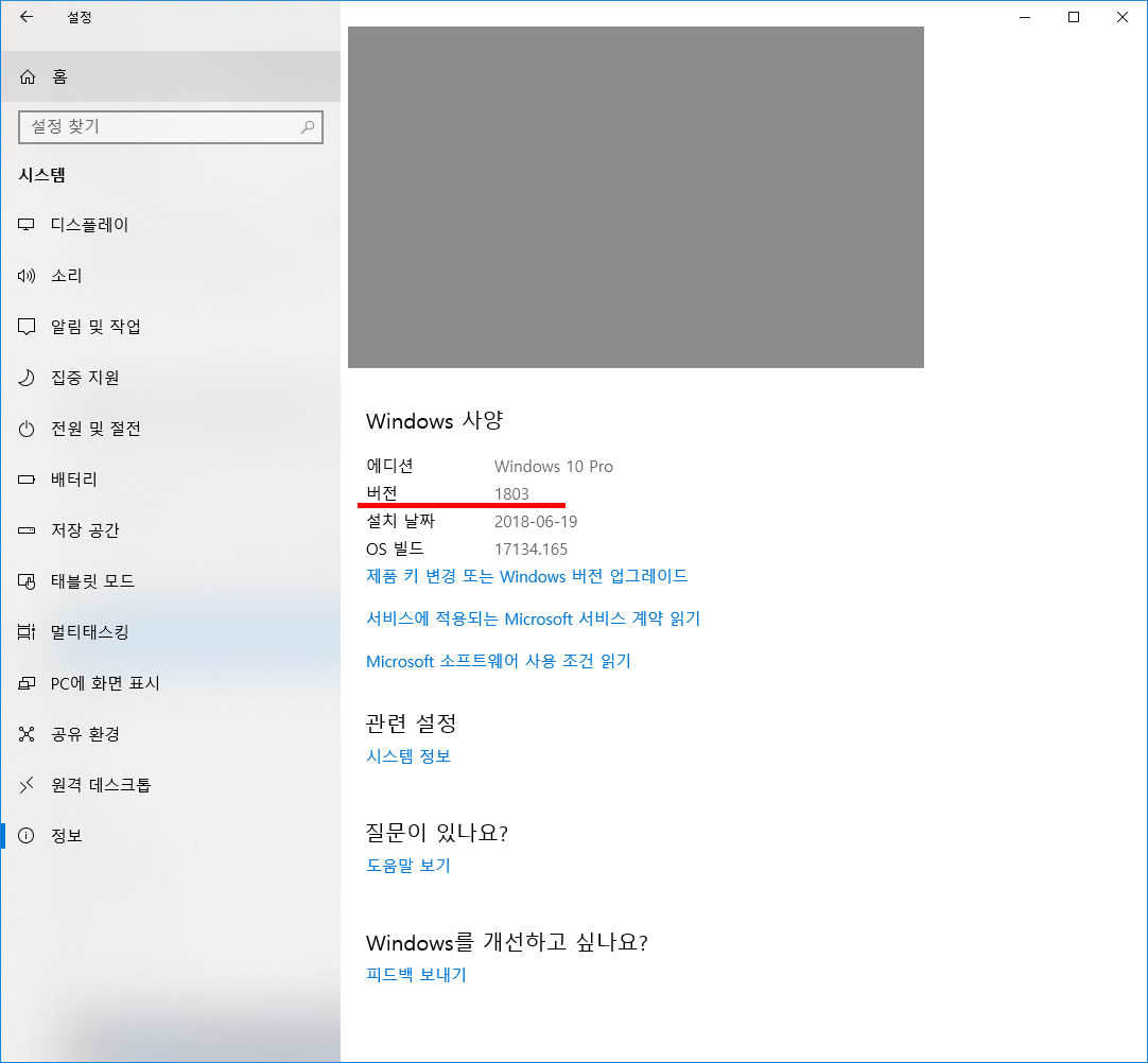 버전 확인 방법은 [설정-시스템-정보] 에서 확인 가능합니다.