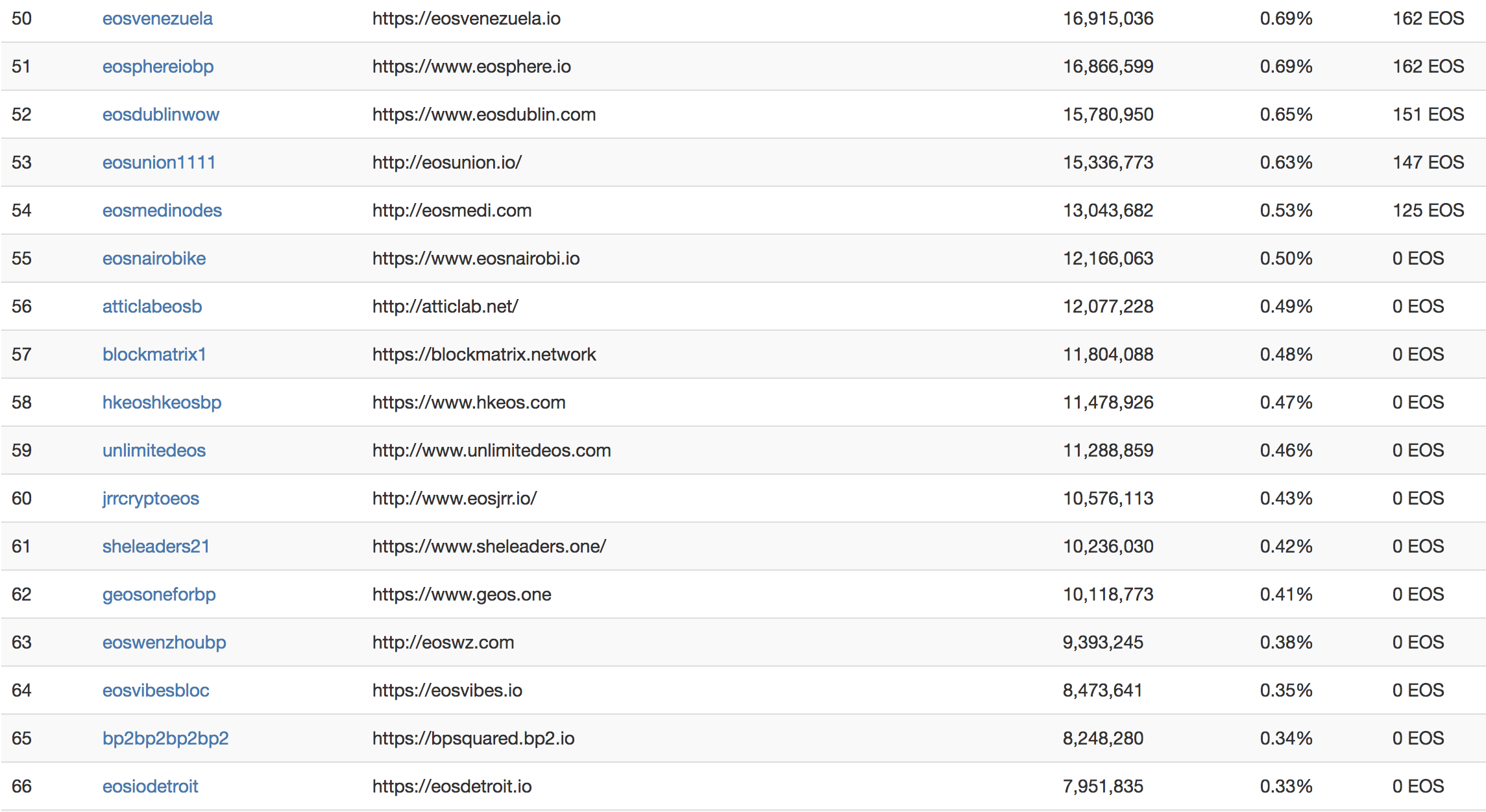 区块生产者排名: 目前,有21个区块生产商积极生产区块,33个备用区块生产商处于有偿状态。 底特律EOS目前排名第66位,仅次于有偿职位。 我们是自筹资金的,但只能维持这么长时间,没有积木奖励. 确保分散和繁荣的EOS 理想的情况是既需要提高投票率,又需要更多的有薪职位上的区块生产者获得区块奖励. 要成为付费区块生产商,您必须获得至少~ 0.5%的选票。