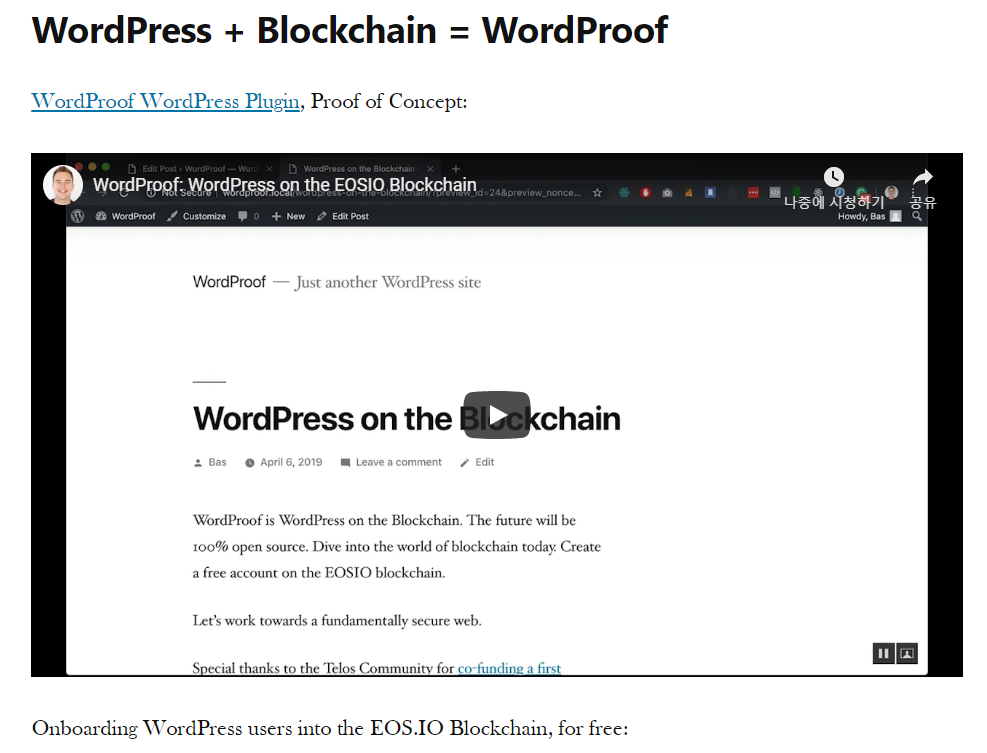 웹사이트 제작 및 콘텐츠 관리 솔루션 WordPress를 블록체인으로 가져온 'WordProof'입니다. WordProof는 EOS Mainnet, Telos 및 EOS Jungle Testnet과 통합된다고 밝혔으며, 오픈소스 WordPress 플러그인으로 시작하여 사용자들이 블록체인에 무료로 콘텐츠를 타임스탬프할 수 있다고 밝혔습니다. WordProof의 첫 번째 버전은 2019년 2분기에 발표 될 예정입니다.