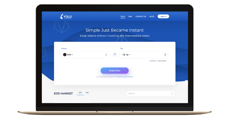 Kyber 프로토콜로 EOS 네트워크에 토큰 스왑을 제공하는 분산화된 거래소 'Yolo' 입니다. 스캐터 등과 연동을 통해 쉽고 빠르게 EOS 기반 토큰들의 거래와 환전을 지원하며 ETH기반 토큰들과의 교환도 지원하는 DEX입니다. Bancor와 함께 선의의 경쟁과 발전을 해 나갈 수 있기를 기대합니다.