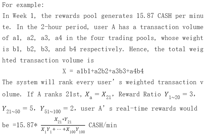 20% of the total amount of CASH tokens is used to set up an independent bonus pool to reward users who rank TOP100 in all trading volume. In order to ensure the long-term sustainable development of the project, allow the majority of users to have space to participate and prevent whales from diluting common users’ income. With TOP100 real-time trading volume, 3 sections are made :