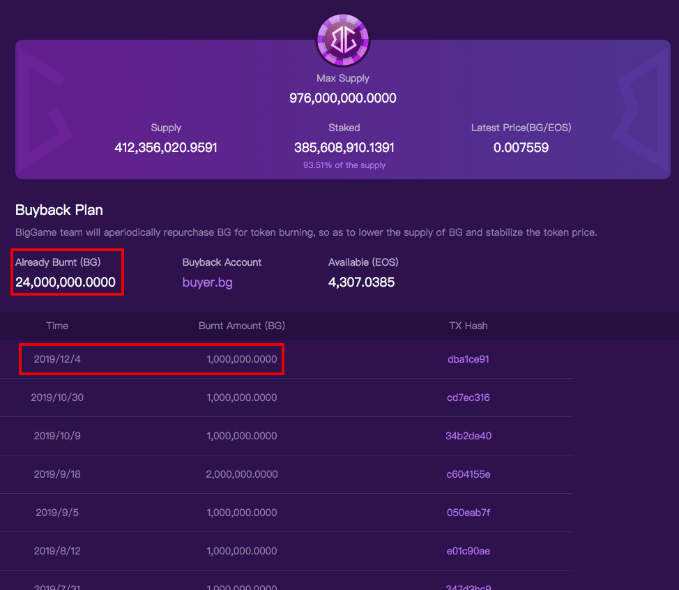 12월 5일 빅게임은 시장에서 BG토큰을 매입하였고 100만개를 소각하였습니다. 현재까지 총 10번 소각을 진행하였고 2,400만개의 토큰이 소각되었습니다. 한달에 2번 100만개식 평균적으로 바이백완료 후 소각진행되고 있습니다.