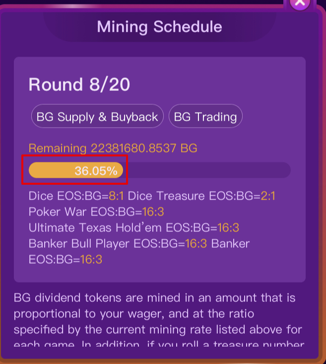 최근 이오스 메인넷의 자원 이슈로인하여 바이백 계정의 이오스가 빅게임 cpu로 긴급 투입되어 바이백은 적극적으로 이루어지지 않았습니다. 대신 바이백 계정에는 8만 이오스가량 적립중이기 때문에 BG 토큰 가격안정화에 더 긍정적인 역할을 할 것입니다.