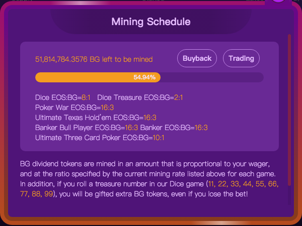 뱅커가 많은 승리를 가져감에 따라서 플레이어 채굴 난이도를 조정 350%까지 토큰이 많이 풀림에 따라 bg/eos 가격은 다소 낮아지게 되었습니다. 또한 플레이어의 자금 사정도 나빠져 볼륨이 줄어든 까닭도 있겠습니다.