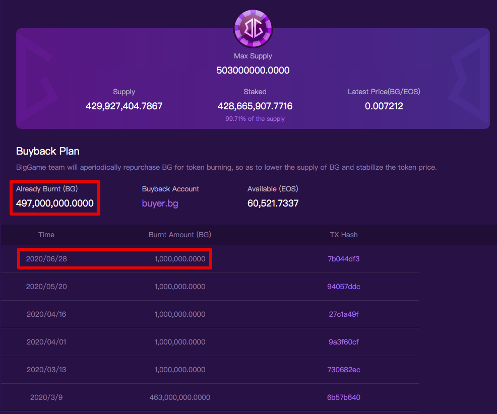 6월 28일 빅게임은 시장에서 BG토큰을 매입하였고 100만개를 소각하였습니다. 현재까지 총 20번 소각을 진행하였고 4억 9,700만개의 토큰이 소각되었습니다. BG 토큰의 가격이 급등하는 등의 특이 사항이 없을 경우 비지 팀은 매달 200만개의 토큰을 바이백하여 소각할 계획입니다. BG토큰 200만개의 가격은 EOS 3200원 기준 5,120만원에 해당하며 매달 소각됩니다.