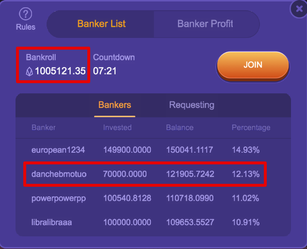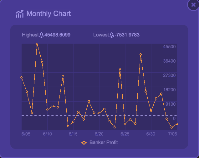 최근 뱅커의 승률이 매우 높았습니다. 플레이어가 뱅커에 계속지면서 베팅 볼륨이 줄어들기도 하였지만 이후 꾸준한 볼륨을 유지하고 있습니다. 뱅커의 승률이 높아지면서 유저들이 대거 뱅커에 투자하면서 뱅커에는 100만 EOS가 넘게 적립되었습니다.